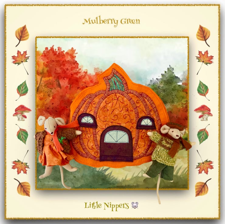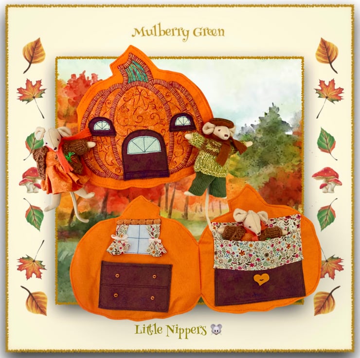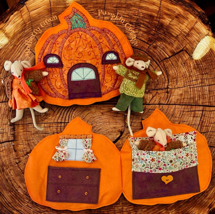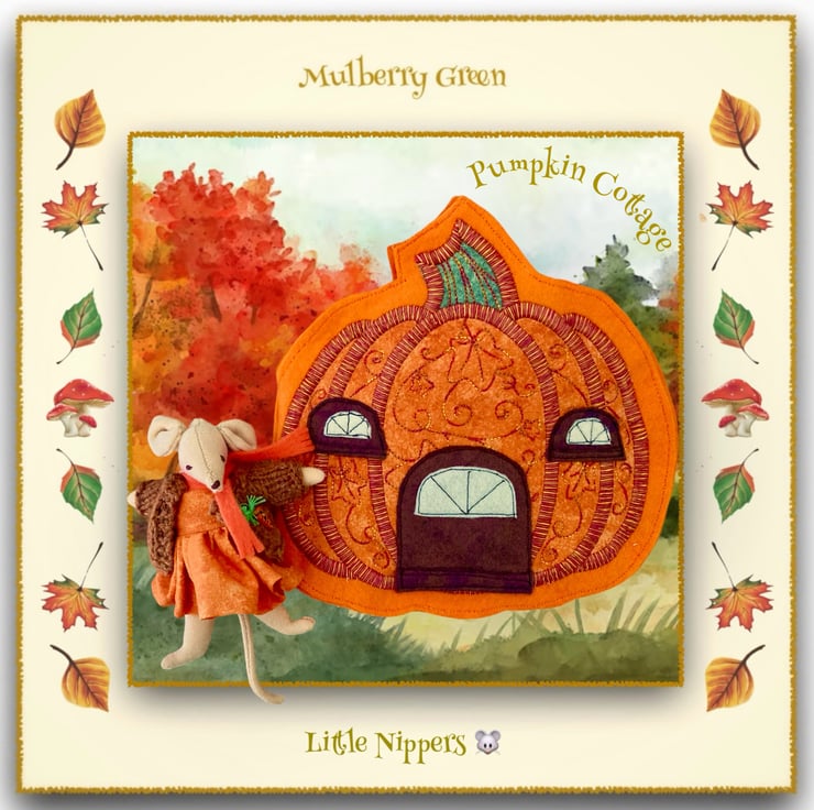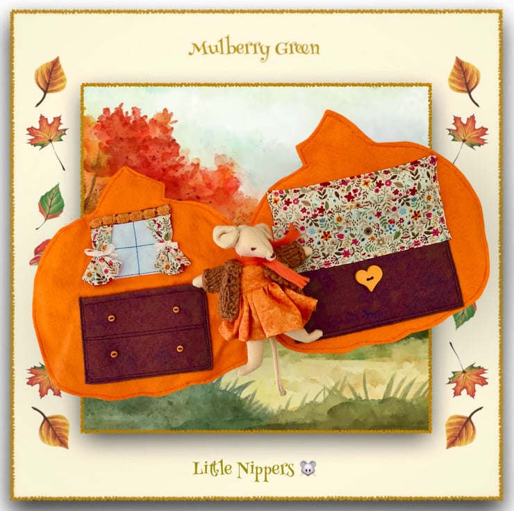 Pumpkin Cottage - a Little Nipper house from the maze of little burrows and passages underneath the barn at Mulberry Farm. The cottage is embroidered onto felt and inside has a cute little bed, with a quilt and comfy pillow, just big enough for a little mouse, a chest of drawers pocket and a little window with pretty curtains.
