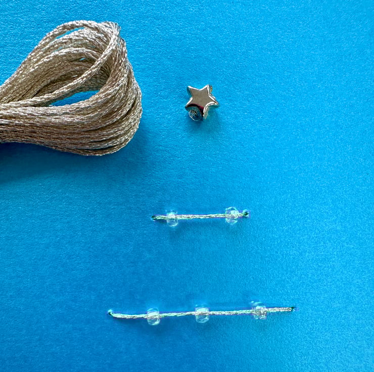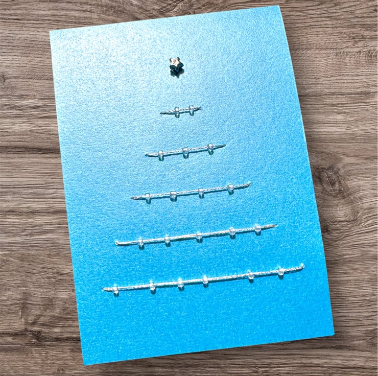 This abstract tree is on a bright pearlescent blue card and depicted using a sparkly silver metallic thread and is embellished with clear glass seed bead baubles and topped with a shiny silver metal star.