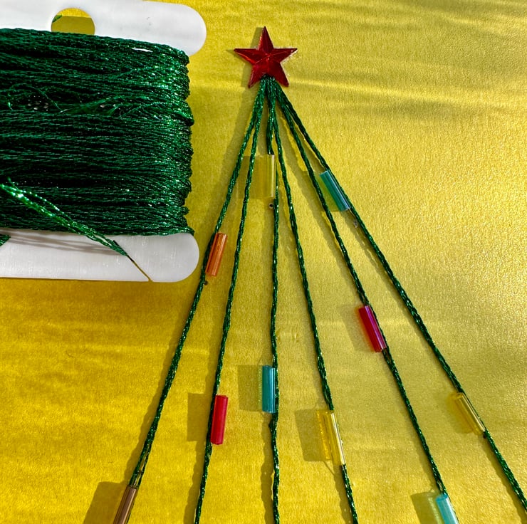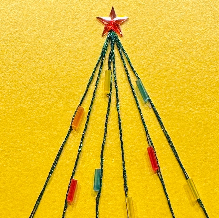 This abstract tree is on a bright pearlescent yellow card and depicted using a bright metallic green thread and embellished with long glass seed bead baubles and topped with a shiny red star.