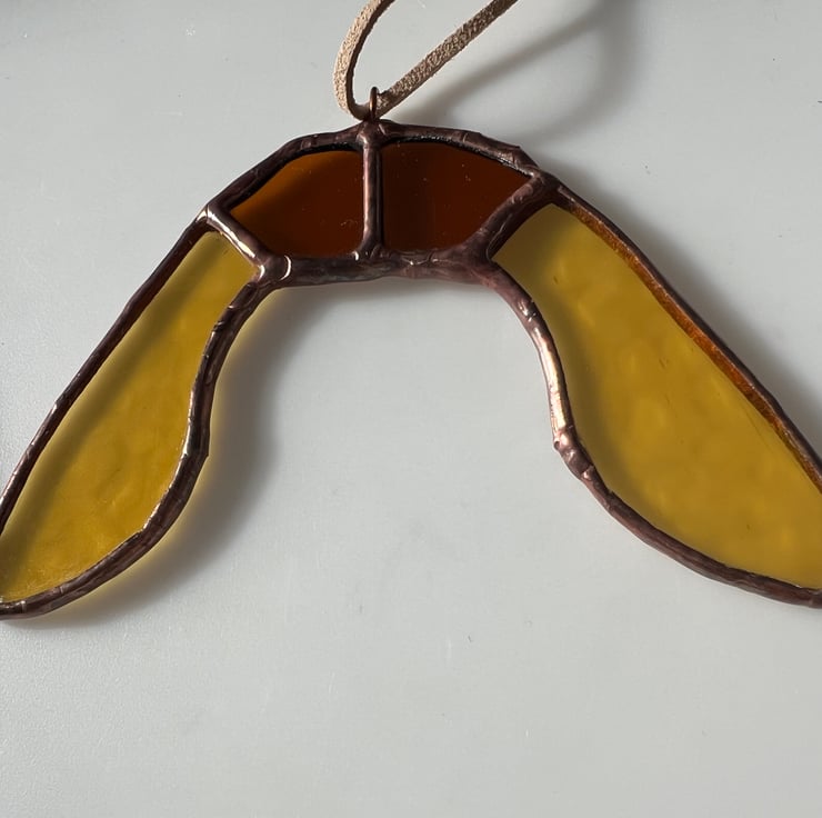 A stained glass sycamore seed in a unique assortment of glass with a pretty copper patina, suspended on a vegan leather cord.