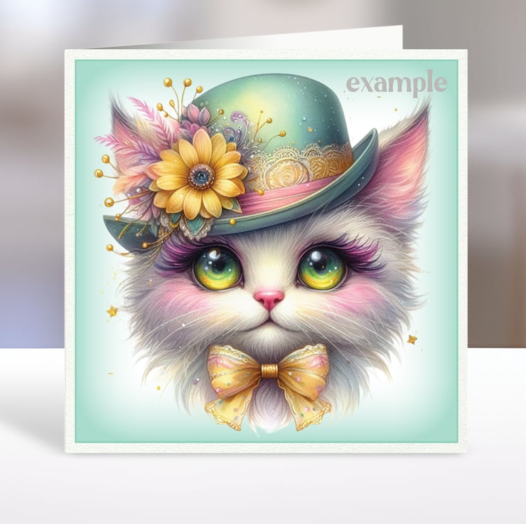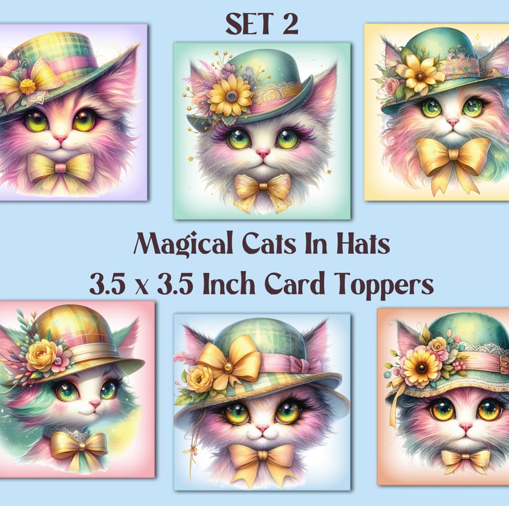 A set of six 3.5 inch square card toppers - Magical cats in hats set 2 of 3