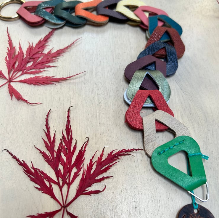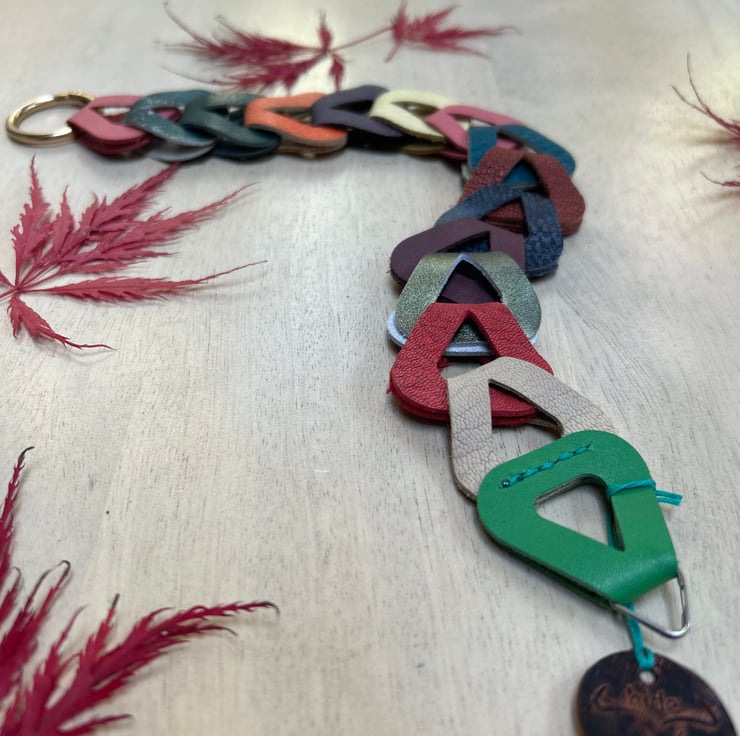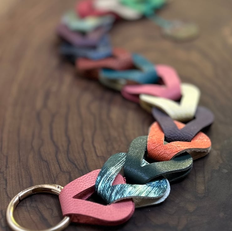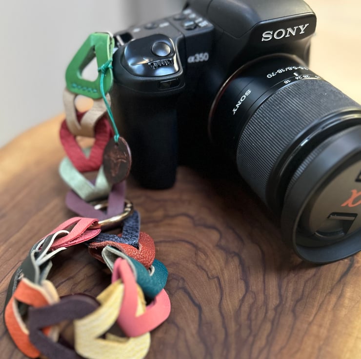 Leather camera wrist strap handmade with interlocking multicoloured leather loops that create a chain effect. The soft leather is cushioning and comfortable to wear for shooting frames all day long while offering the photographer a stylish, individual look.