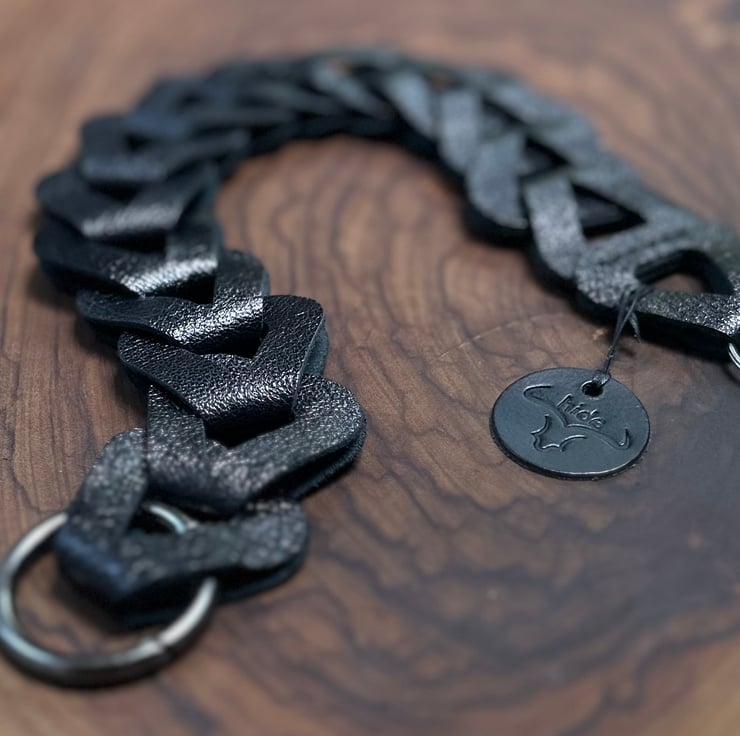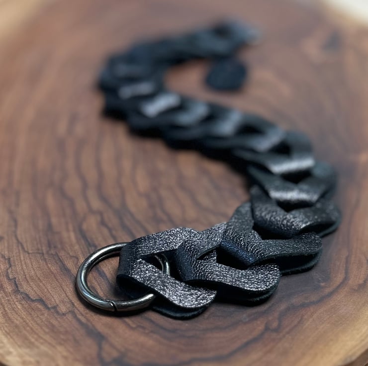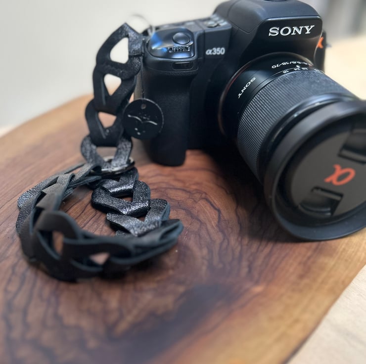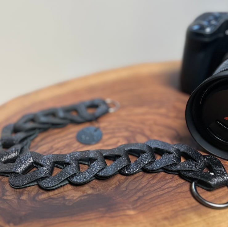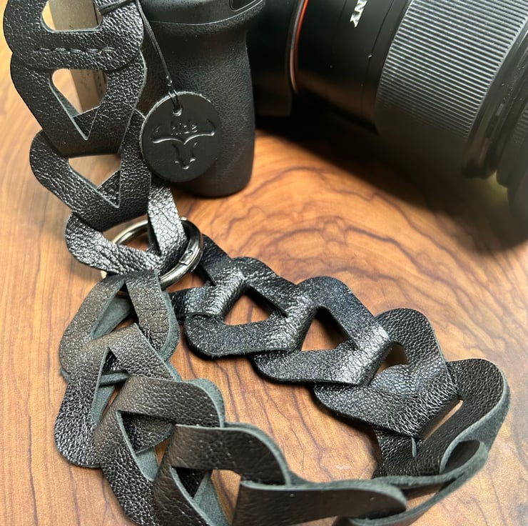 Leather camera wrist strap handmade with interlocking black leather loops that create a chain effect. The soft leather is cushioning and comfortable to wear for shooting frames all day long while offering the photographer a stylish, individual look.