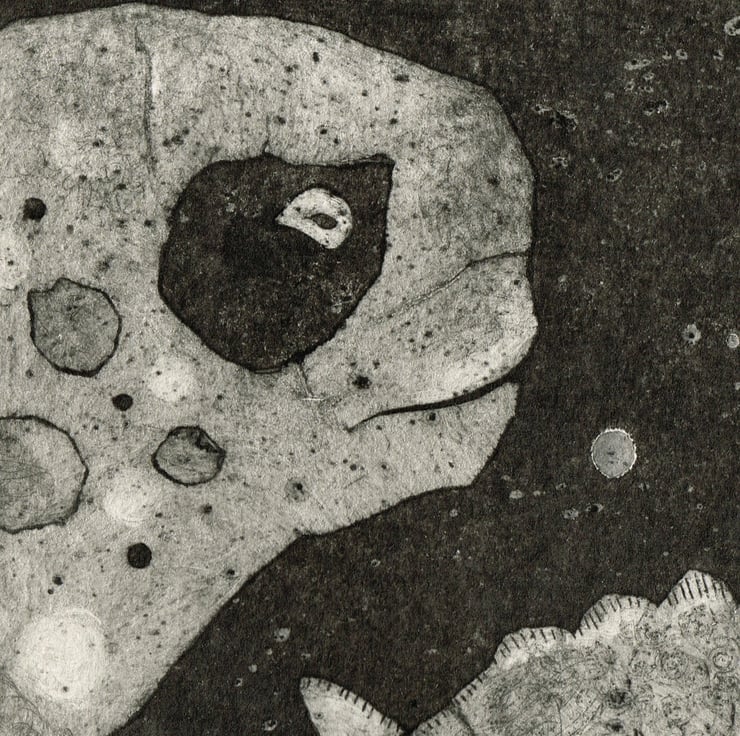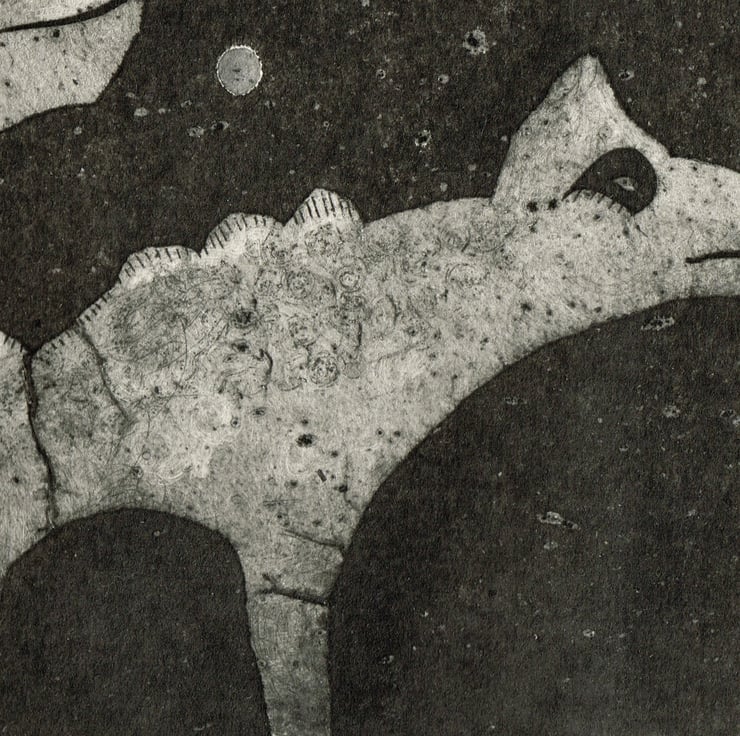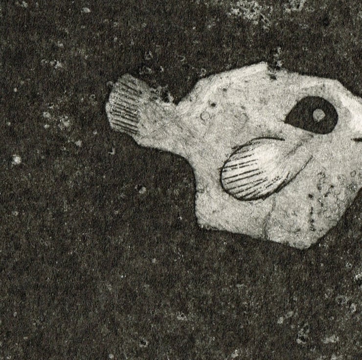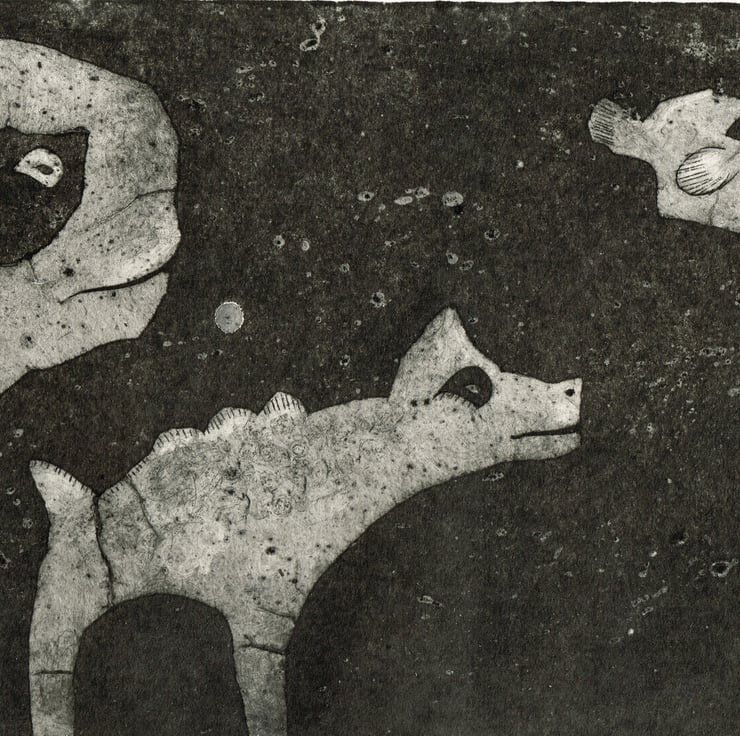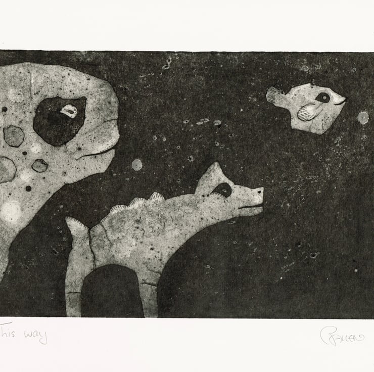 This print is titled ‘ This way ‘ It’s a collagraph print and the printing plate is made from little pieces of recycled tin foil. The print is 26.5cm x 20.5cm and the etched area is 21cm x 14.5cm. It is printed on slightly cream watercolour paper, using Akua soya based inks. I haven’t numbered this print but due to the nature of the materials used in the printing process. I can usually only get about 10 prints from the plate, so it is a very small print run.