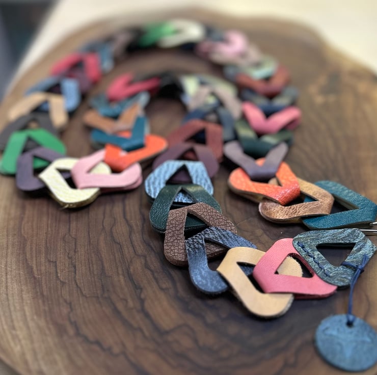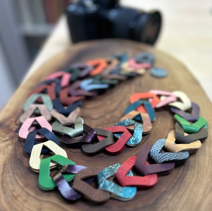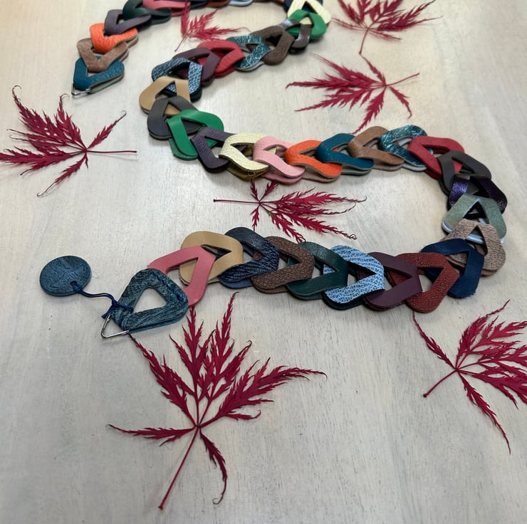 Leather camera neck strap handmade with interlocking multicoloured leather loops that create a chain effect. The strap structure absorbs weight making the camera feel much lighter. The soft leather is cushioning and comfortable to wear for shooting frames all day long while offering the photographer a stylish, individual look.