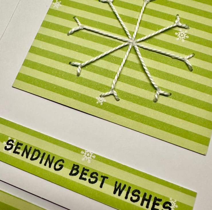 These snowflakes have been hand embroidered in a thick white perle 5 cotton thread on a bright lime green and white striped card with tiny snowflakes and then fixed onto a quality white thick background card. A coordinating band of colour holds a choice of 3 different greetings.