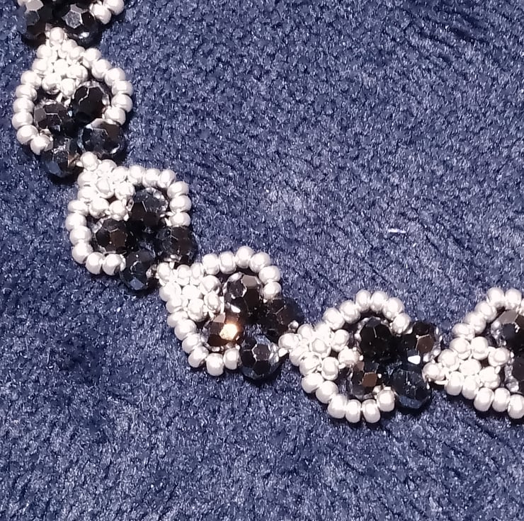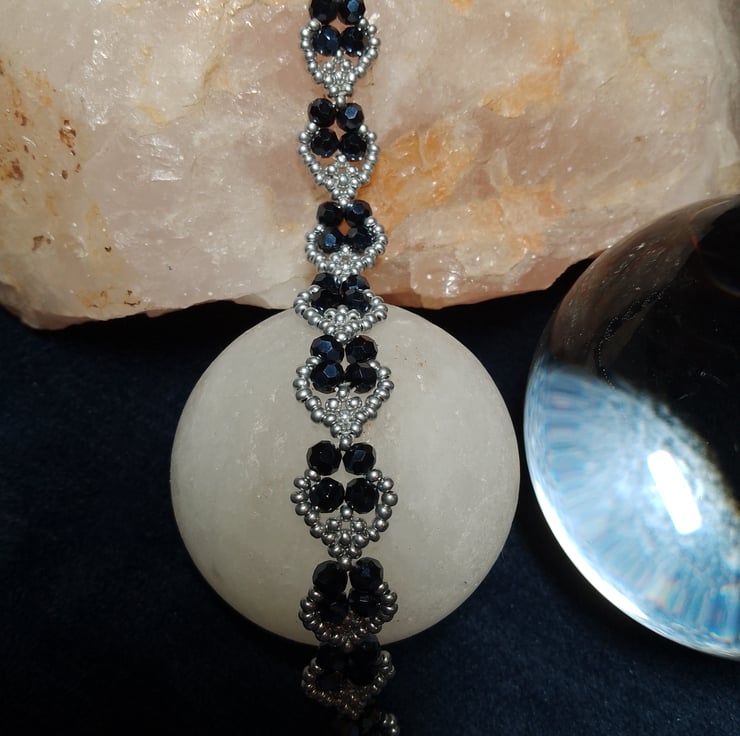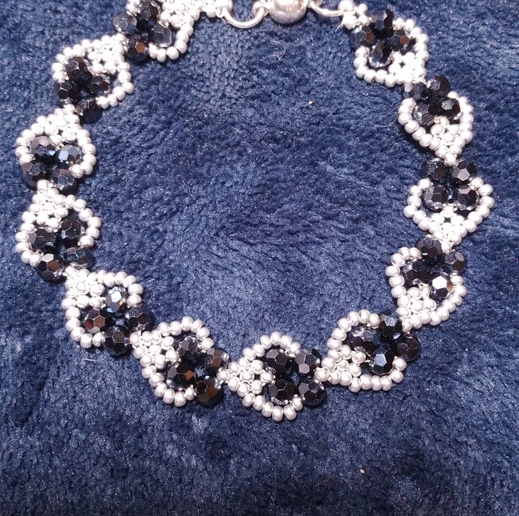 Beaded heart shaped bracelet using black rondelles and silver coloured seed beads, finished with a small silver magnetic clasp