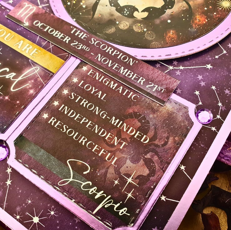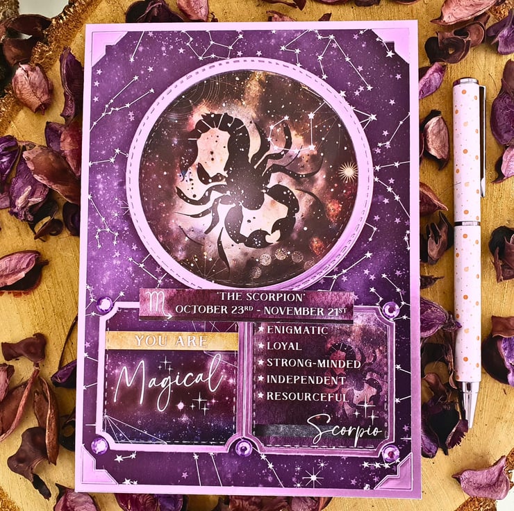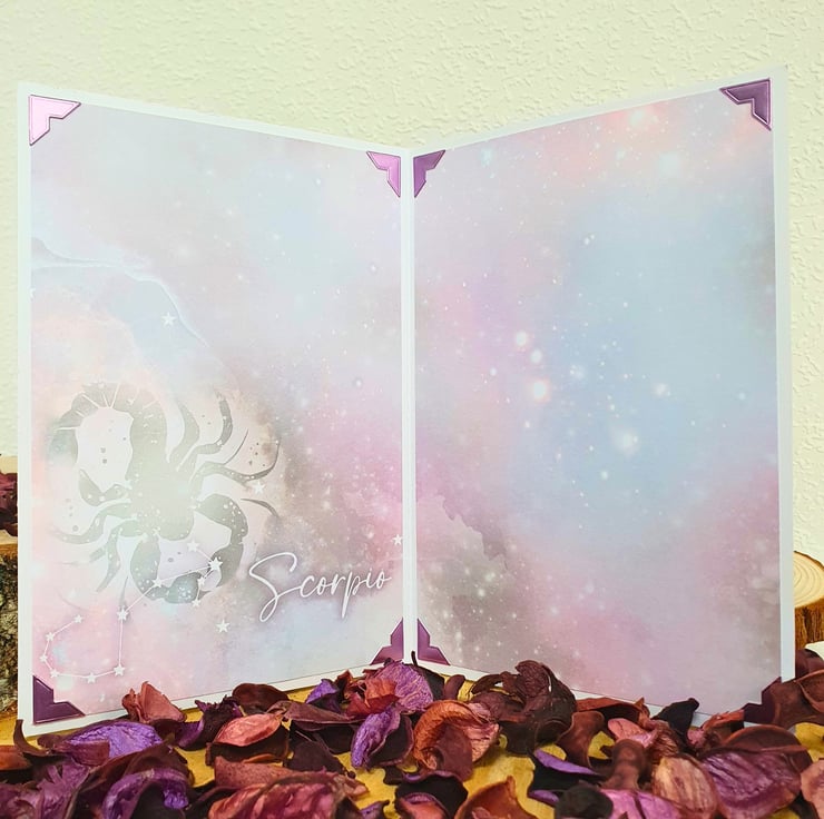 The card consists of mats & layers of soft amethyst / purple satin card & luxury paper printed with an astrological pattern, decorated with Scorpio zodiac sign toppers. It displays the margin dates of the Scorpio birthdays & also some of the personality characteristics. It is embellished with Amethyst / Purple diamante gemstones. Finished with two panels of coordinating inserts, blank, for you to add your own messages and wishes. Decorative photo corners give a unique finish to the card.