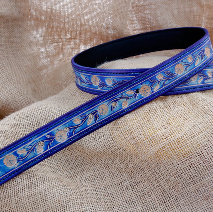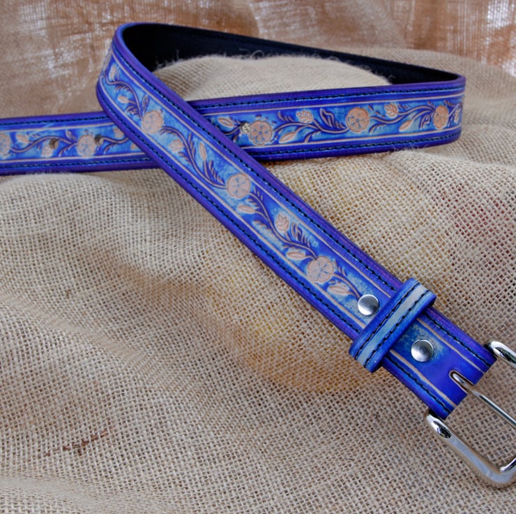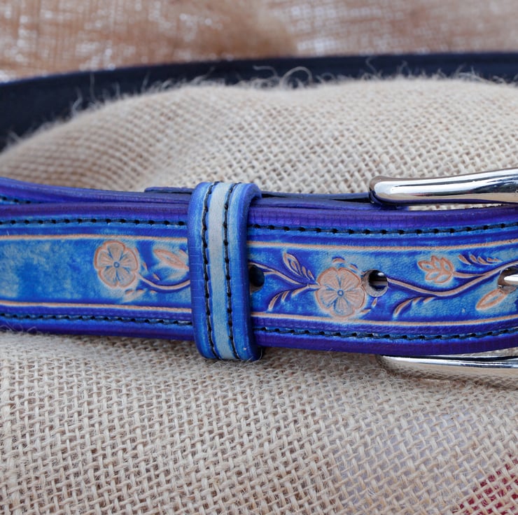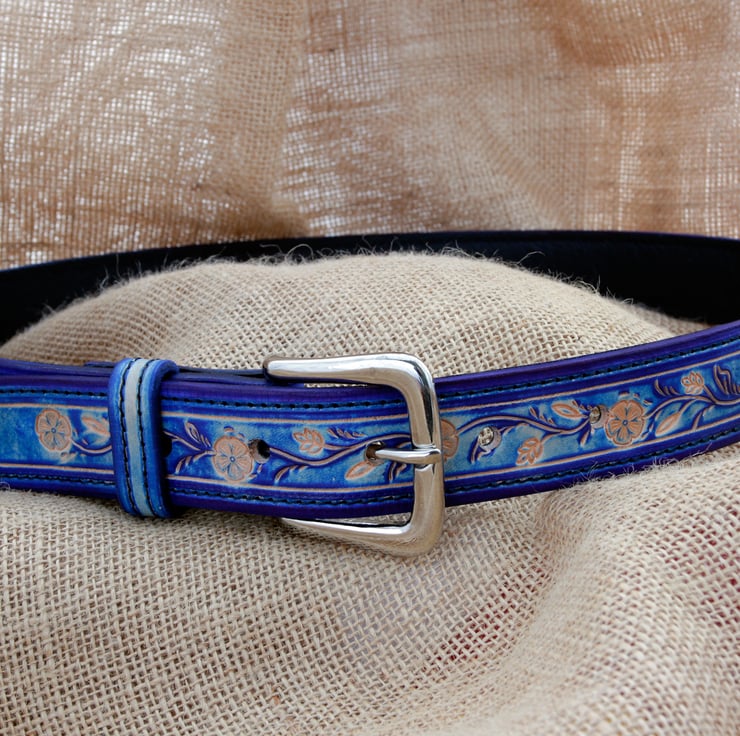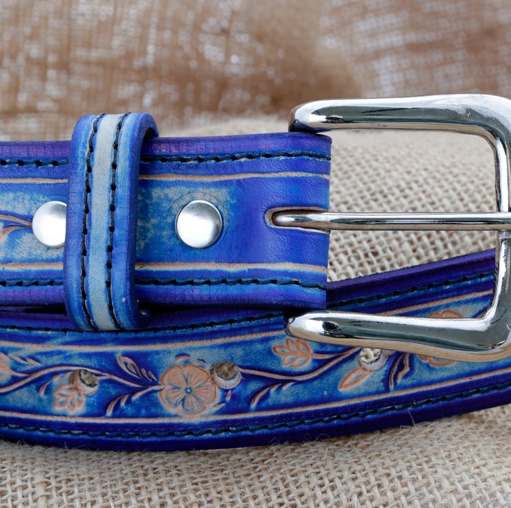 Handmade blue floral leather belt. This belt has been made from high quality vegetable tanned leather, hand tooled with a floral design and hand dyed blue for a unique one of a kind appearance. It has been fitted with a nice chunky silver coloured buckle and a matching stitched blue keeper to secure the end.