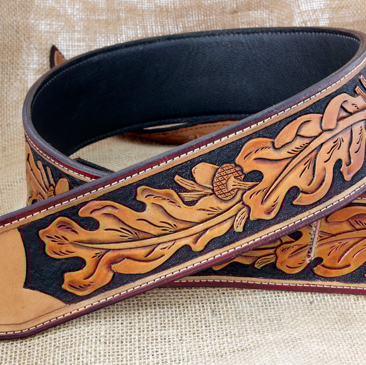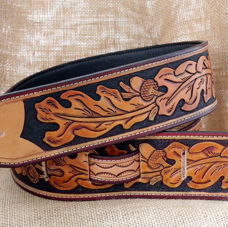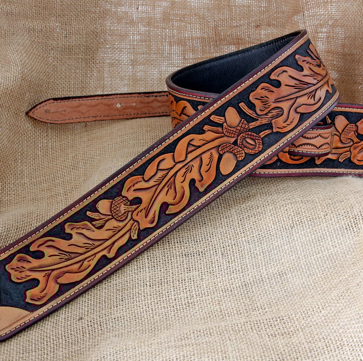 Handmade leather guitar strap hand tooled with a traditional oak leaf and acorn design. Made from high quality veg tan cowhide and lined with soft brown clothing grade leather for comfort, this beautiful strap will compliment any guitar and will last for many years. Can be used with either electric or acoustic guitars.