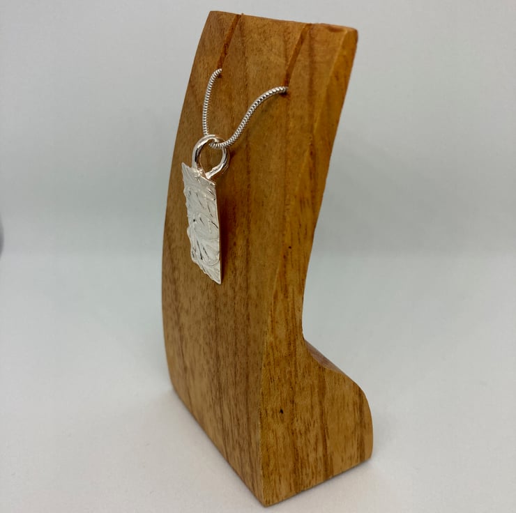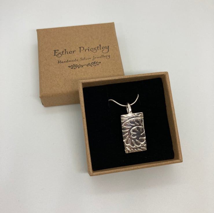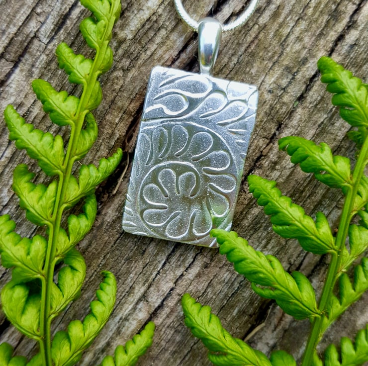 This silver pendant with a textured fern design, was handmade after my visits to New Zealand. The rectangle of silver hangs from a sterling silver chain and the pendant itself is about 2cm long and 1 cm wide, it fits easily into the palm of the hand.