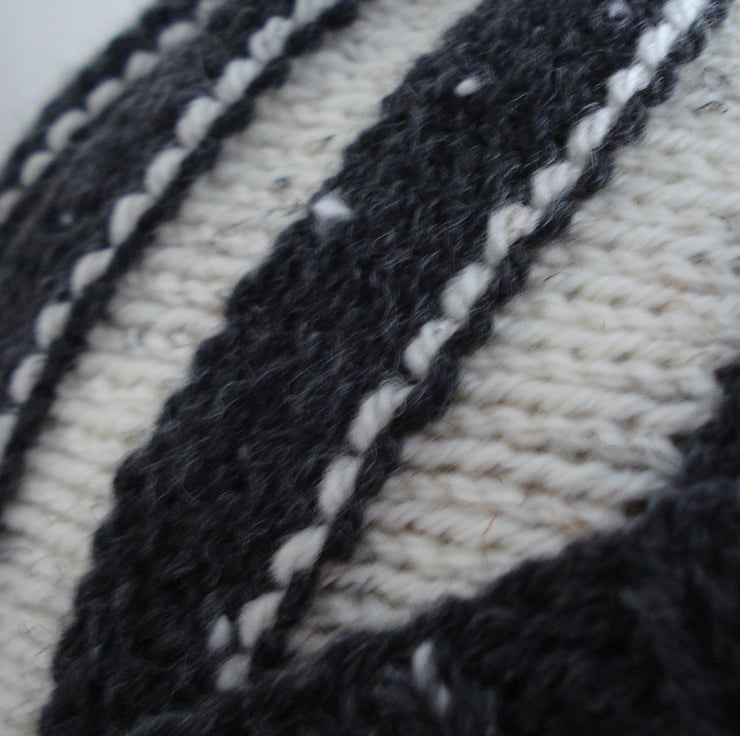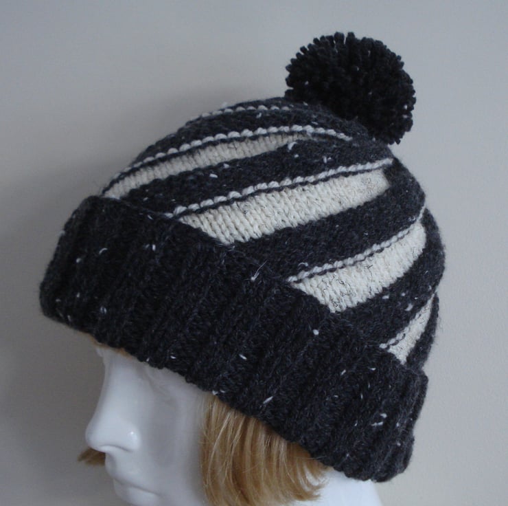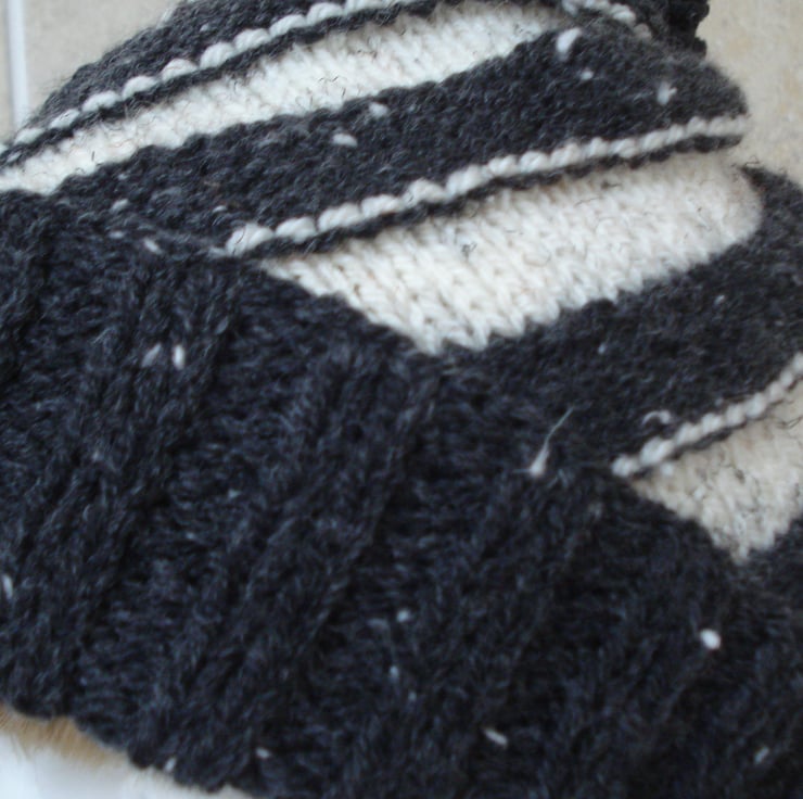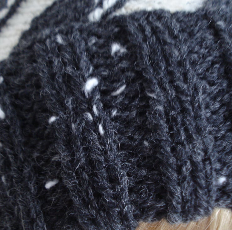 This is a lovely thick hat knitted in a twist pattern with a bobble on top. The black is a soft colour with flecks of white and the oatmeal yarn has small flecks of black. Hand knitted from thick Aran wool and acrylic yarn. Would fit an adult head. Great gift for those winter months.