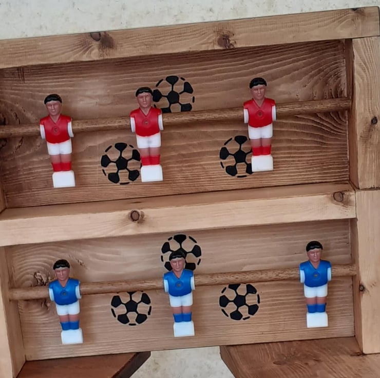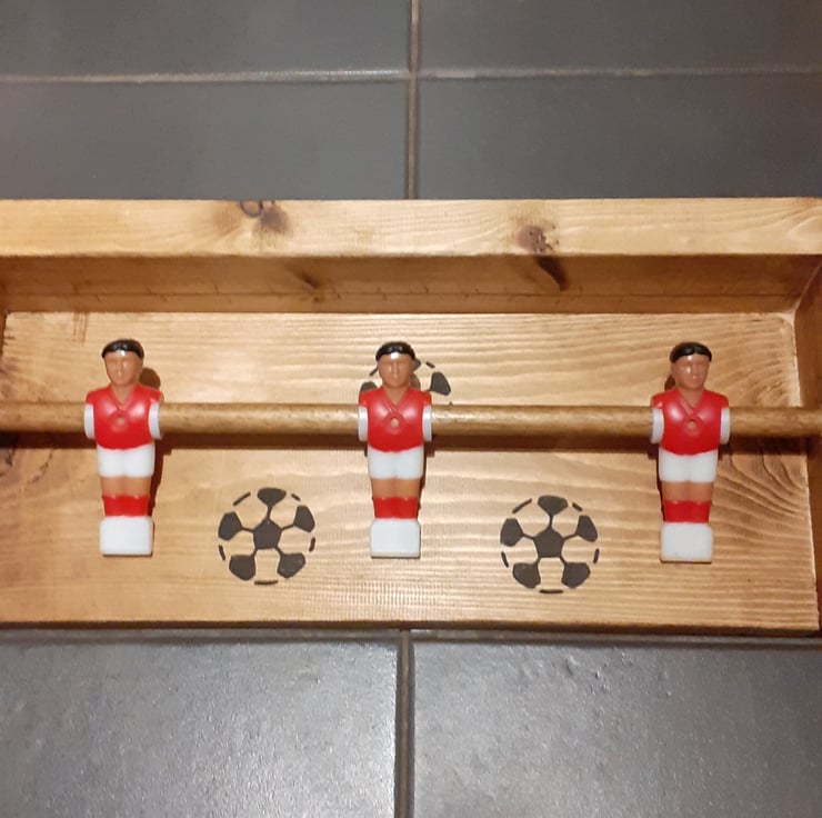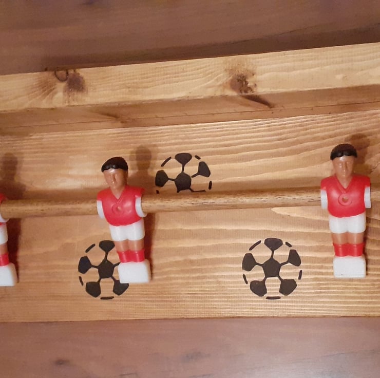 Wooden football themed coat rack. Handcrafted from the best quality timber. Practical and a nice feature. Made from a solid frame, designed to look like a goal. The top can be used as a shelf, moveable players to use as the hangers. Two keyhole hangers fitted. Available in different sizes and colours. Different player kits available. Size of the rack shown is 26cm high x 10 cm deep x 42cm long. When ordering choose the amount of players required and the kit colours. Frame is finished in a light shade to emphasis the players and footballs. Please note all kit colours will have white shorts. Thanks