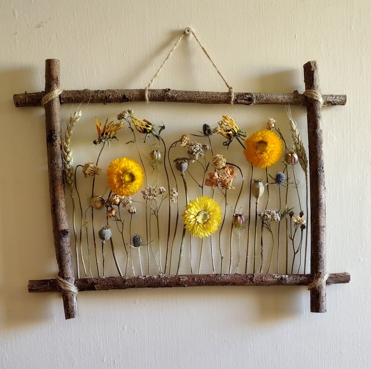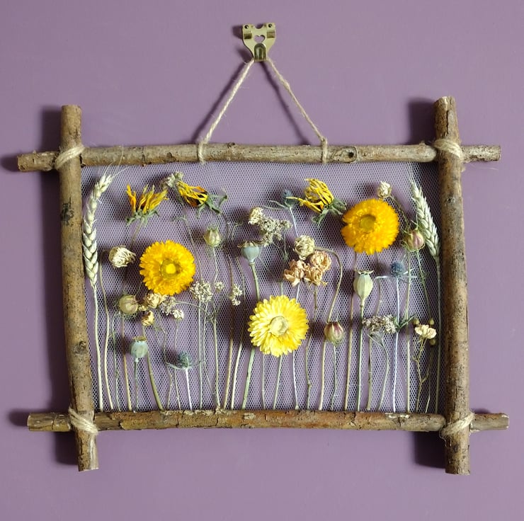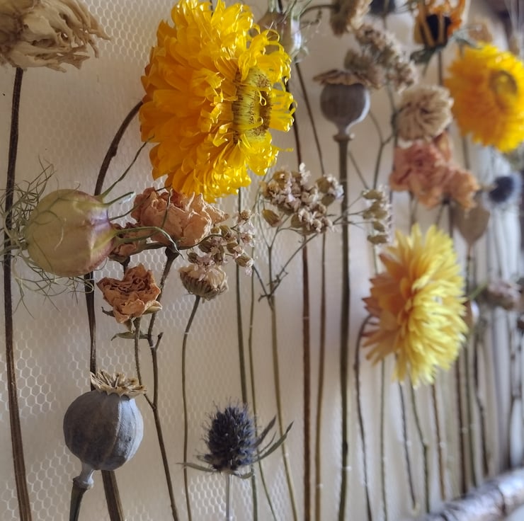 The piece comprises dried flowers carefully stitched onto white recycled tulle, and mounted on a willow frame, allowing each stem to be appreciated for its beautifully perfect imperfections. The flowers were organically grown in peat free compost, picked and dried right here in the Fens from our wildlife friendly garden. The willow is also from our garden. The tulle is manufactured in the UK using industrial nylon waste, which would otherwise be sent to landfill or downcycled.