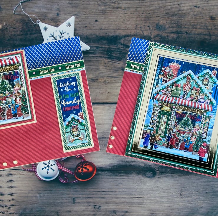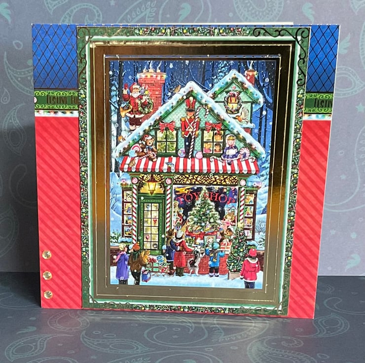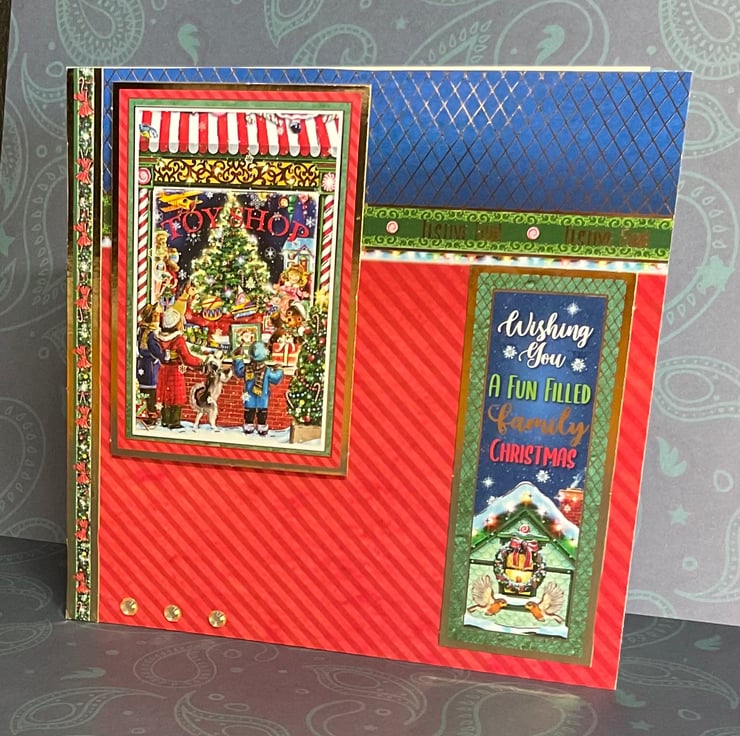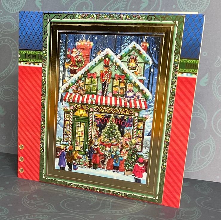 In reds and gold these lovely cards are the perfect way to wish someone Happy Christmas. The cards feature a Christmas toy shop theme which has been layered onto red and blue coordinating card.