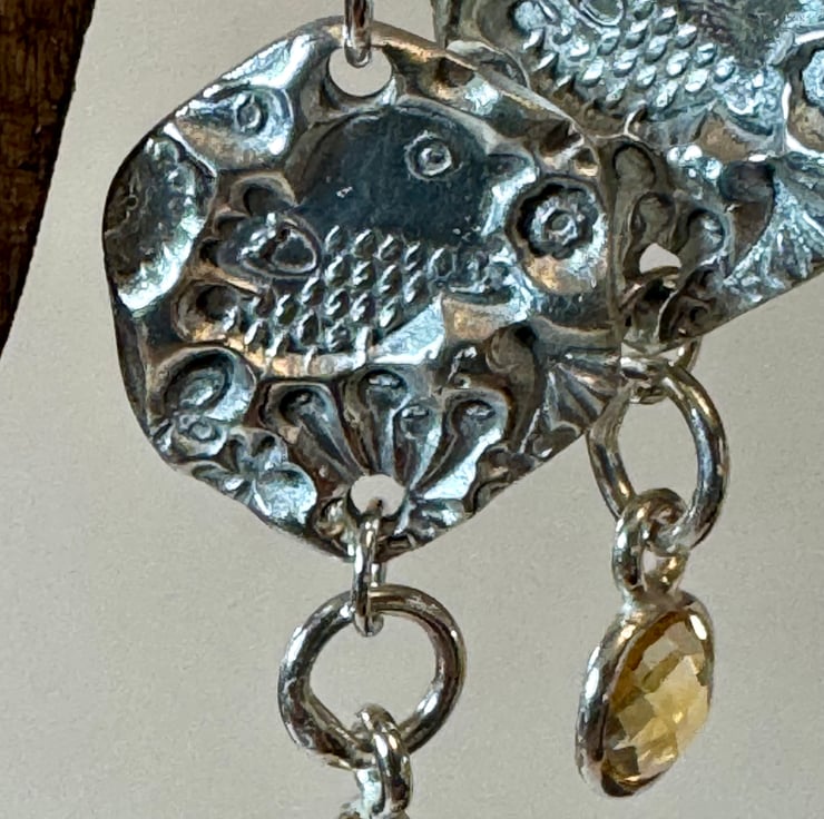 These fabulous bees and birds dangly earrings feature a silver honeycomb shape with a honey coloured citrine gemstone.