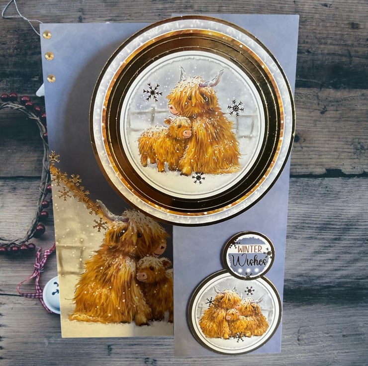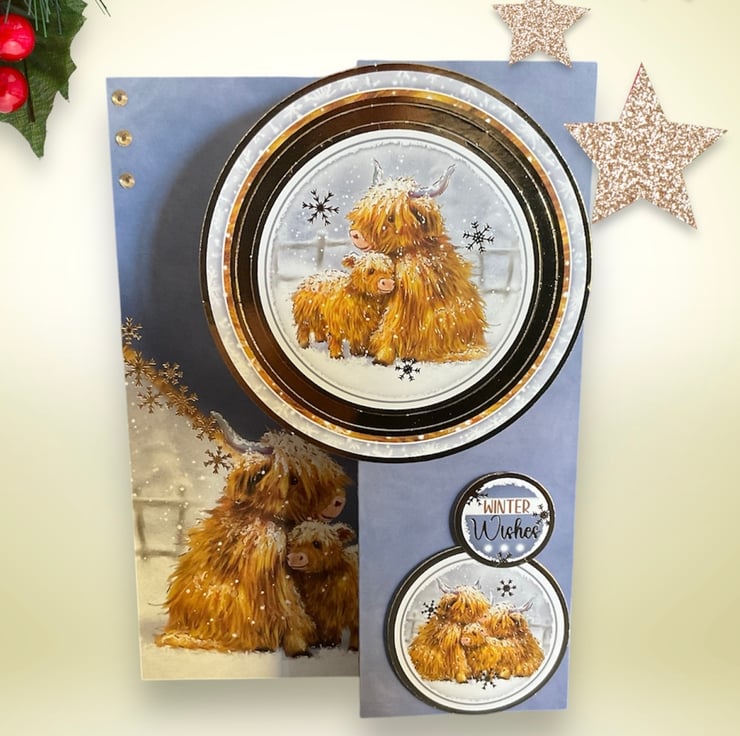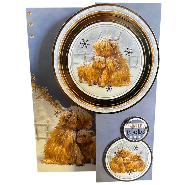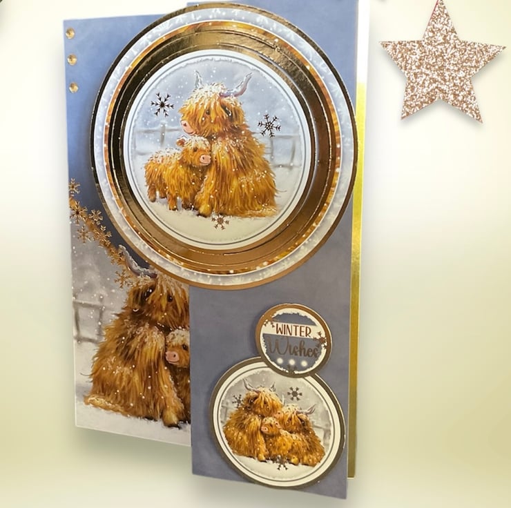 This lovely zig zag card in blues and gold features a lovely Highland Cattle design. Toppers have been added in 3D and features the words Winter Wishes.
