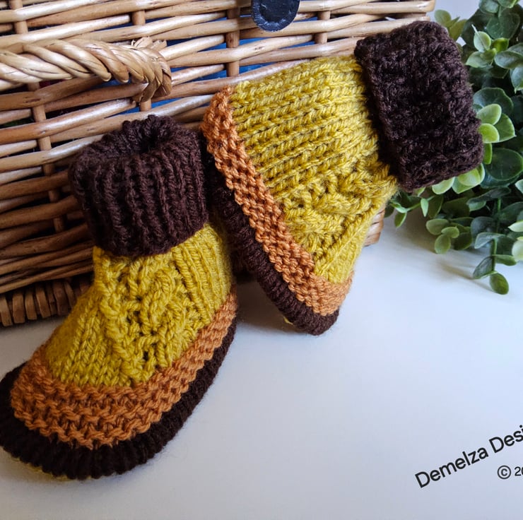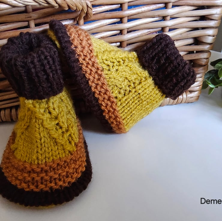 A lovely cosy baby boys rompers and booties set designed by Demelza Designs and crafted in Cornwall. The set has been hand knitted to exceptionally high standards using quality soft French and British manufactured premium machine washable acrylic yarns. The buttons are made from genuine wood with a loving sentiment burnt etched on them. The booties have a piped design sole edge to give a shoe/boot shape on the feet during wear.