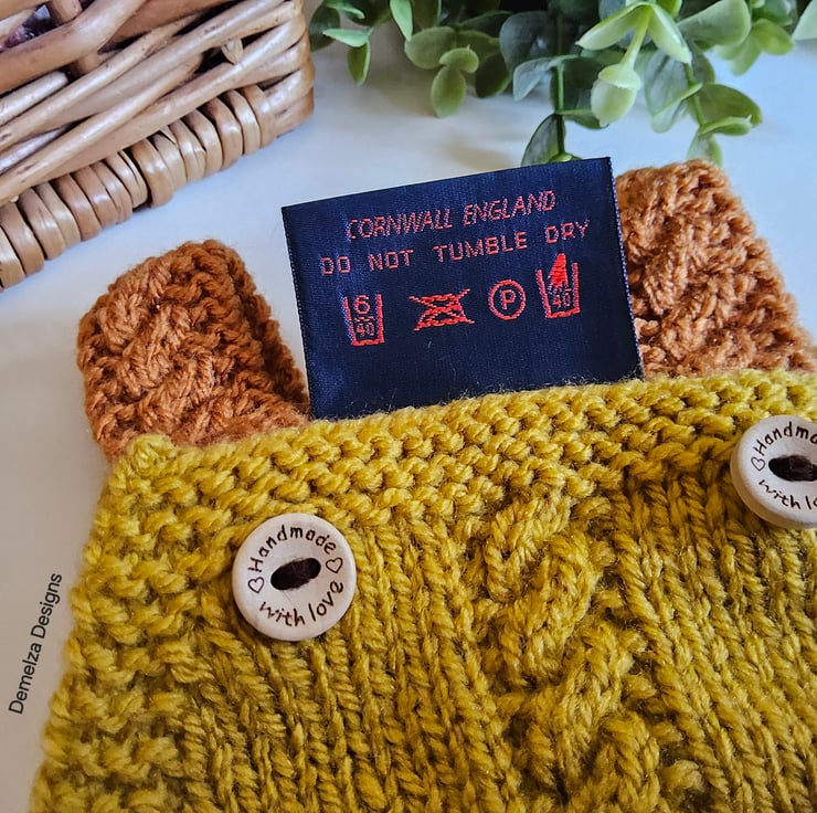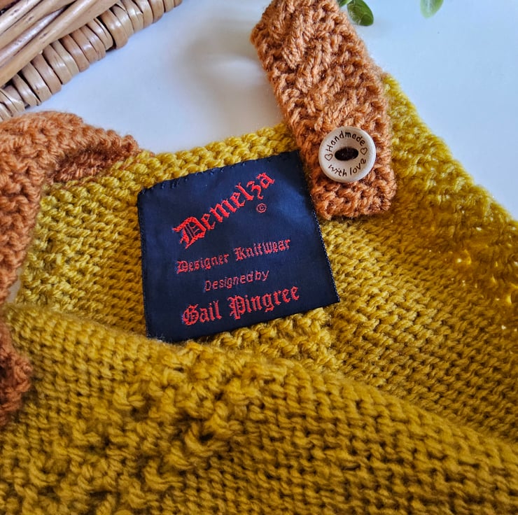 The designer garment tag has been hand stitched to the back bib edge. It has the care instructions woven within it for lasting reference and as proof of it's origins if gifting. A Demelza Designs garment swing tag will be attached to the front of the garment providing a total professional touch.