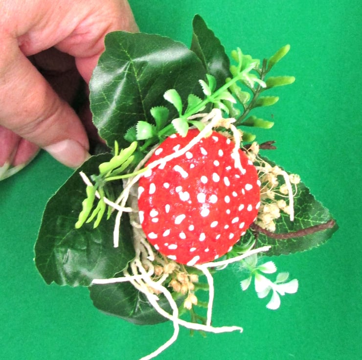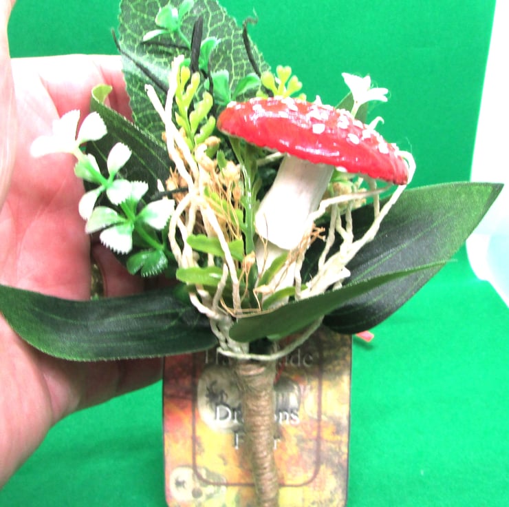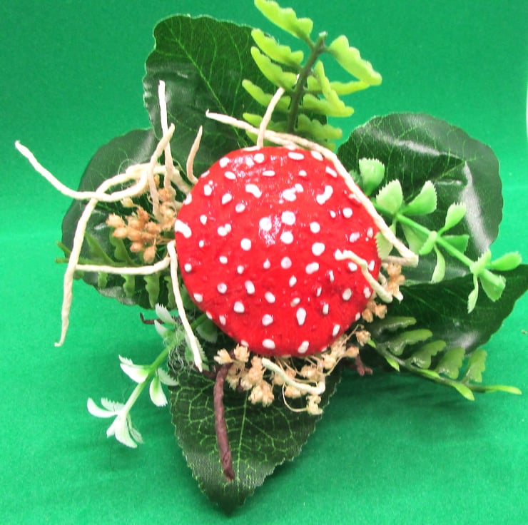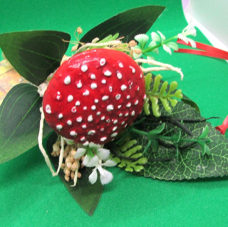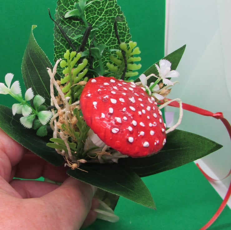 Bring a touch of enchanted woodland magic to your wedding with our handmade corsages and buttonholes, featuring beautifully crafted air-dry clay fly agaric mushrooms, artificial flowers, and leaves.