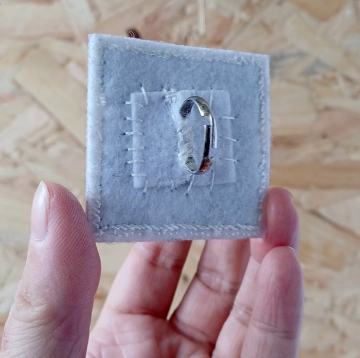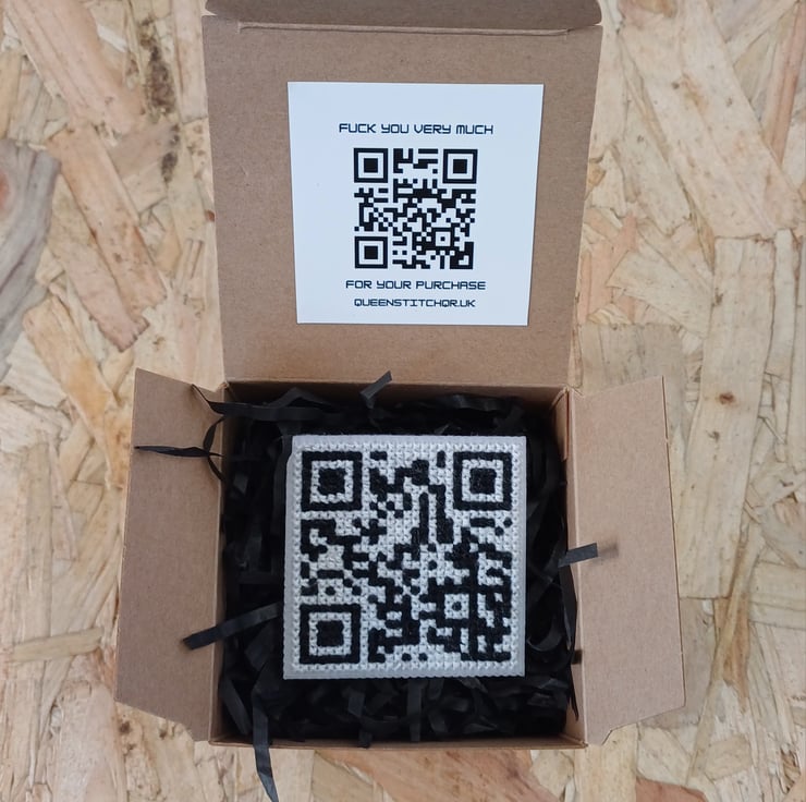 Cross stitched by hand this ring reads "Fuck You" when scanned. It is stitched onto an adjustable ring band for the perfect fit.