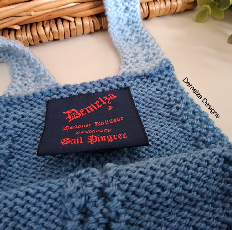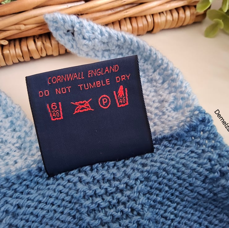 The designer garment tag has been hand stitched to the back bib edge. It has the care instructions woven within it for lasting reference and as proof of it's origins if gifting. A Demelza Designs garment swing tag will be attached to the front of the garment providing a total professional touch.