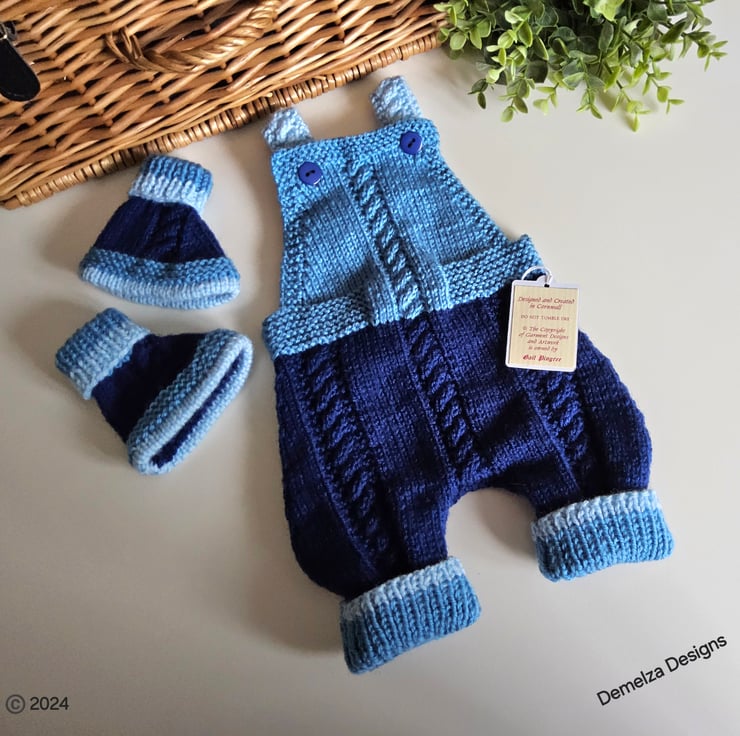 A lovely cosy baby boys rompers and booties set designed by Demelza Designs and hand knitted in Cornwall. The set has been crafted to exceptionally high standards using quality soft French and British manufactured premium machine washable acrylic yarns. The booties have a piped design sole edge to give a shoe/boot shape on the feet during wear.