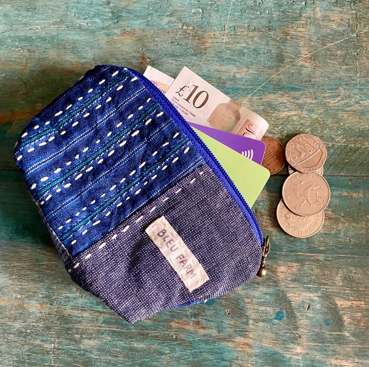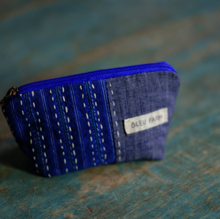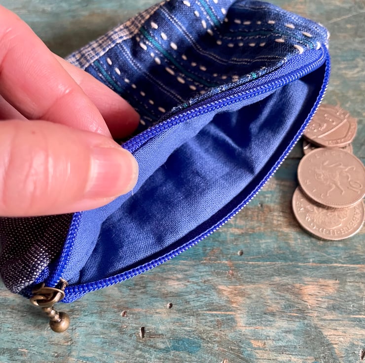 This petite, fully lined handmade zipper pouch is perfect for carrying your loose change, cards or small essentials. Crafted from vintage Chinese cotton fabrics with natural slubs and imperfections, plus my own decorative slow stitching, each pouch is unique.