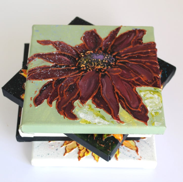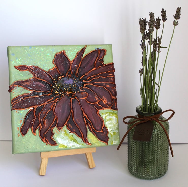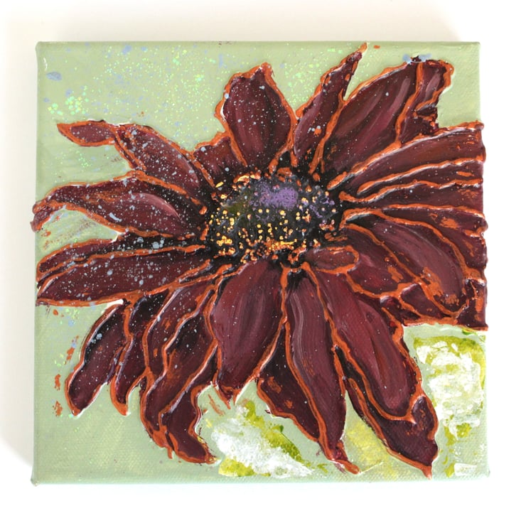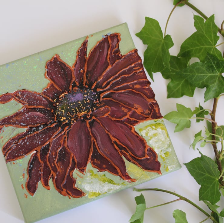 Original painting on stretched canvas of a sunflower. The colour scheme burgundy with a sage green background. Size 15x15cm and depth 1.5cm. The edges are painted and the canvas is light enough to hang on a simple picture hook. Satin varnished to protect. signed with my initials and dated on reverse.