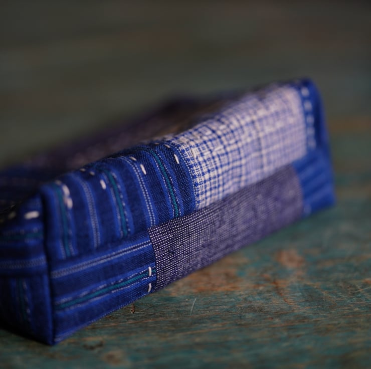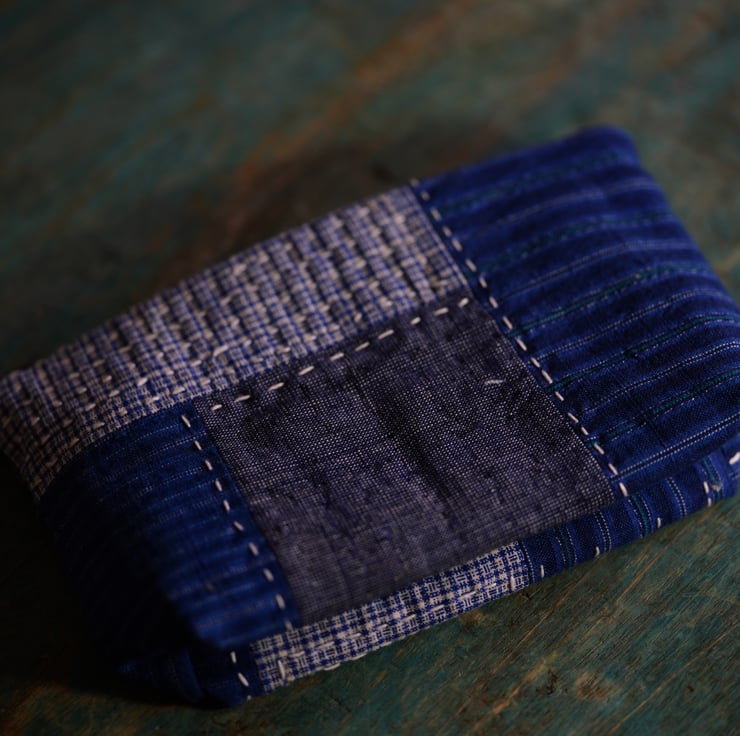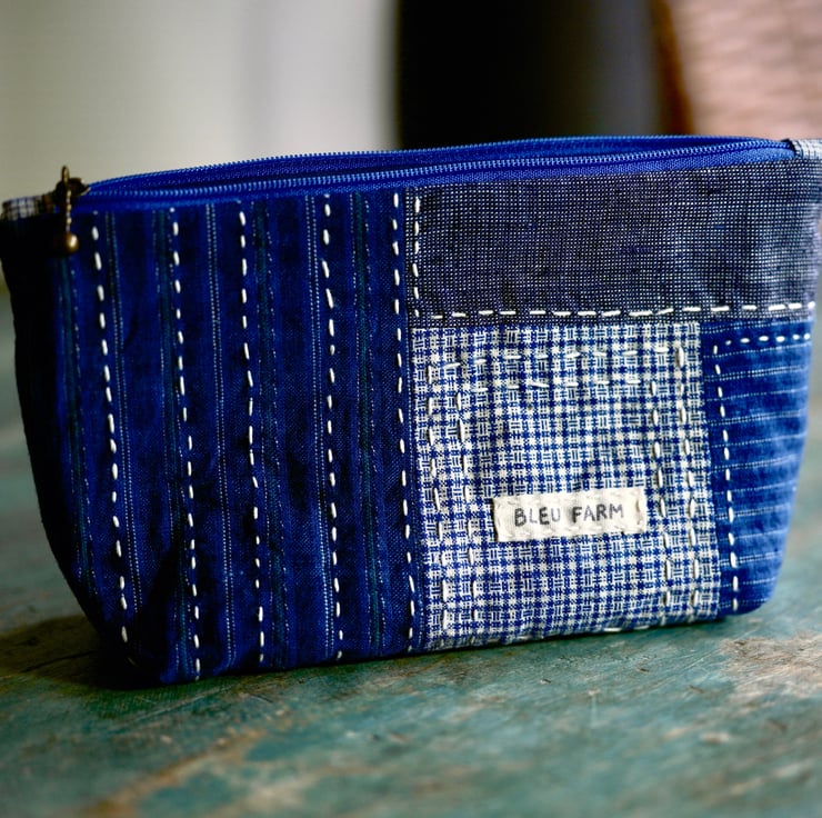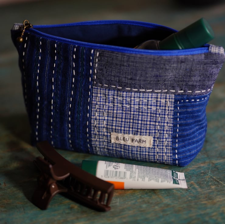 This versatile makeup bag is perfect for storing cosmetics, toiletries, or other small essentials. Handmade from vintage Chinese cotton fabrics, this bag carries the charm of natural textures and slubs from homespun yarns; together with my own decorative slow stitching, it's truly a one of a kind piece.