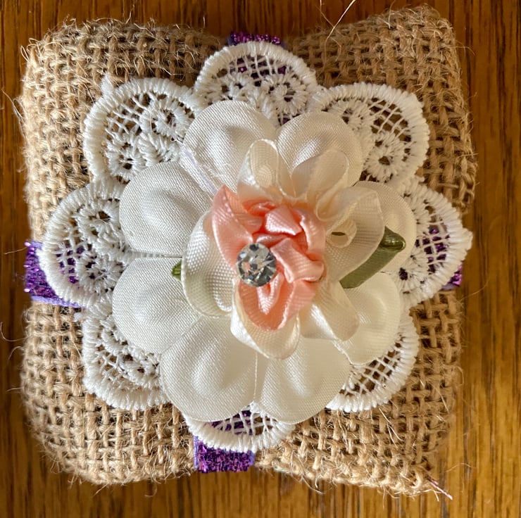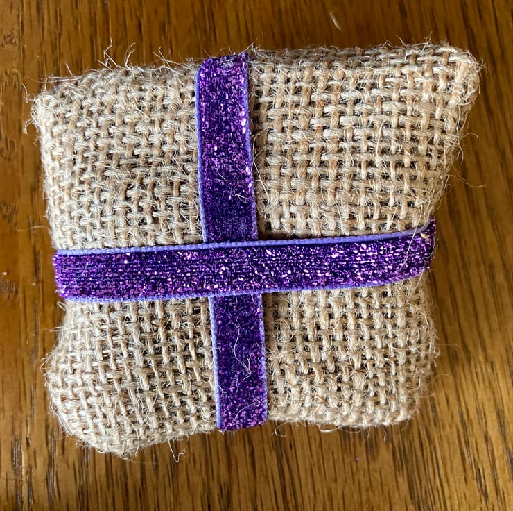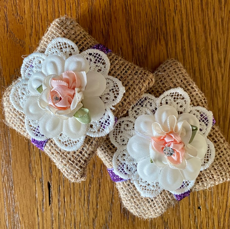 This is a set of 2 lavender bags made with hessian, Norfolk lavender and finished with a sparkly purple ribbon and topped with a lavish lace flower. They can be gift wrapped at no extra cost if desired, just let me know. They are sent via Royal Mail 2nd class small parcel post.