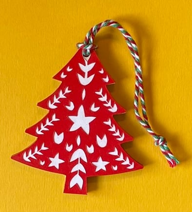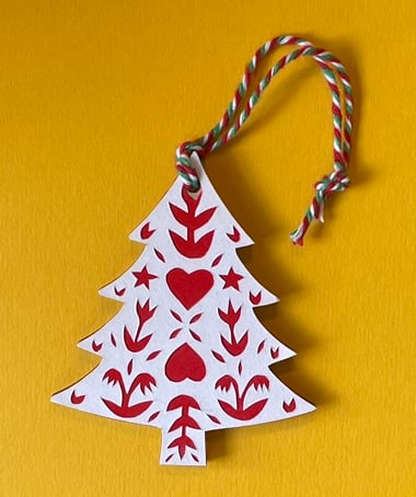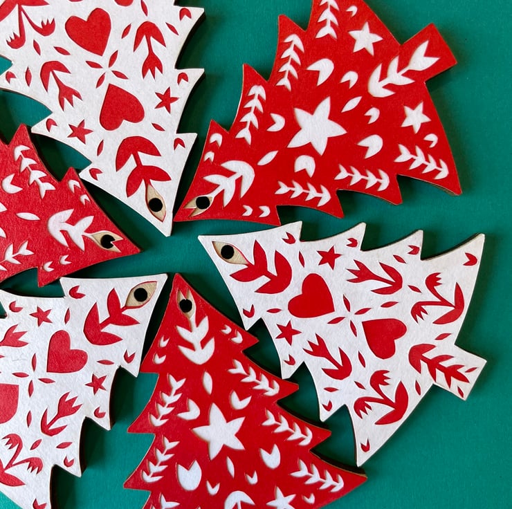 These red and white trees are papercuts carefully applied to wooden shapes and varnished. All of my designs are drawn and cut out by hand.