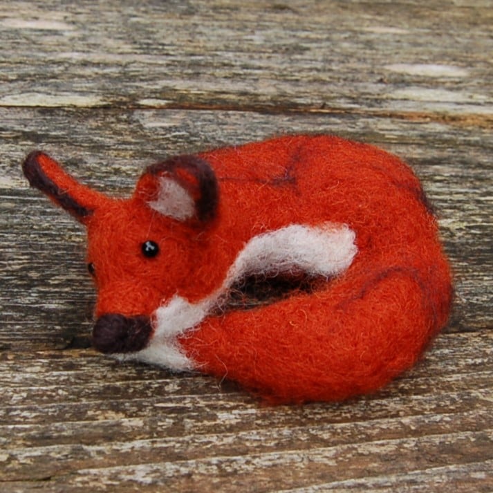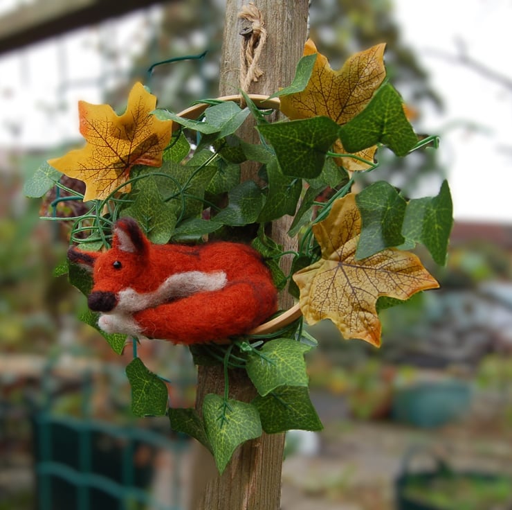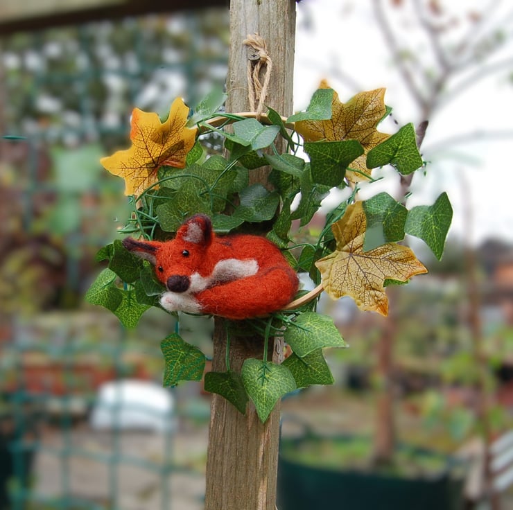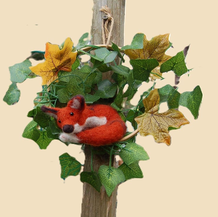 I've used wool fibres to needle felt a lovely curled up with its head on its tail. Attached to a bamboo hoop, with fabric leaves and artificial ivy. I've attached a length of hemp twine as a hanger but the wreath can be also be displayed laid flat. The fox is not attached to the hoop and can be removed if desired.