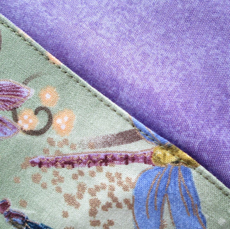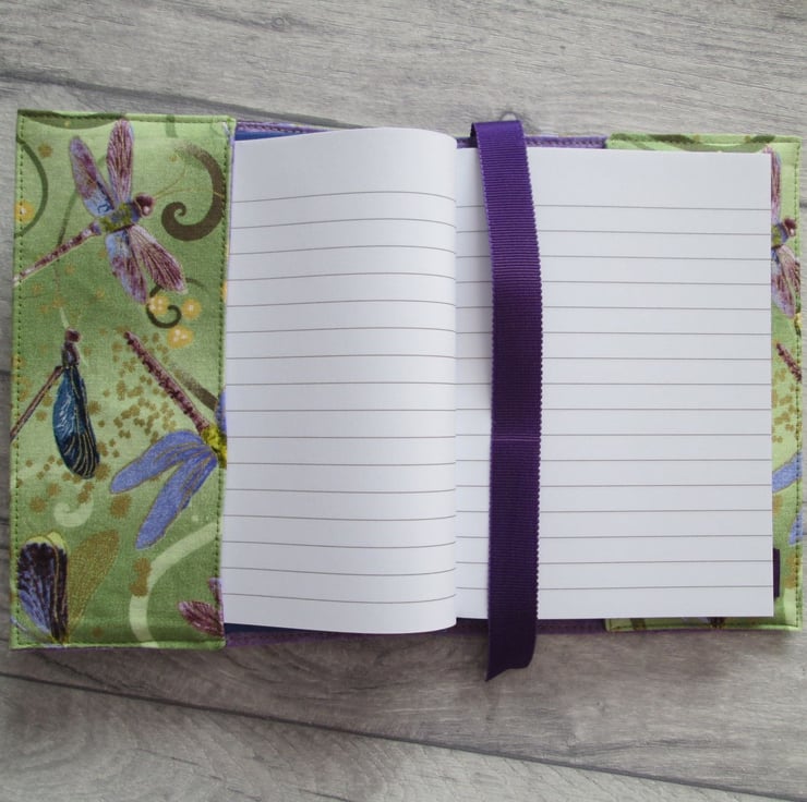 A charming A6 notebook with a reusable cover in lovely willow green cotton, patterned with swirling scrolls and lilac dragonflies all picked out in metallic gold. Lined with violet cotton and incorporating a handy ribbon place marker, this little notebook cover comes complete with a hardback lined notebook ready to use or wrap up as a gift.