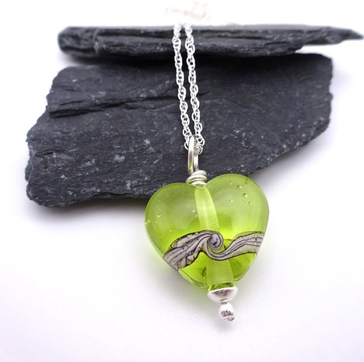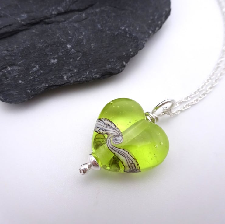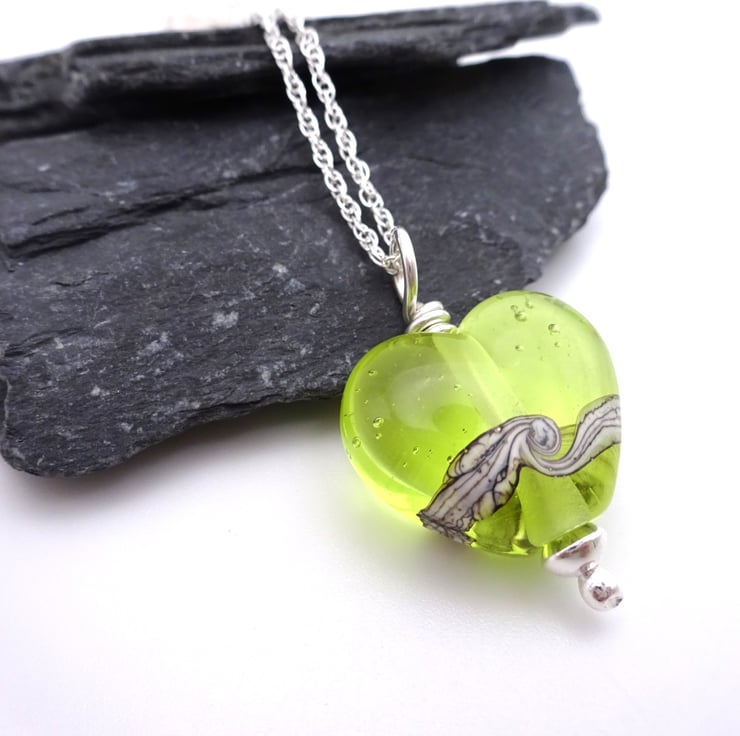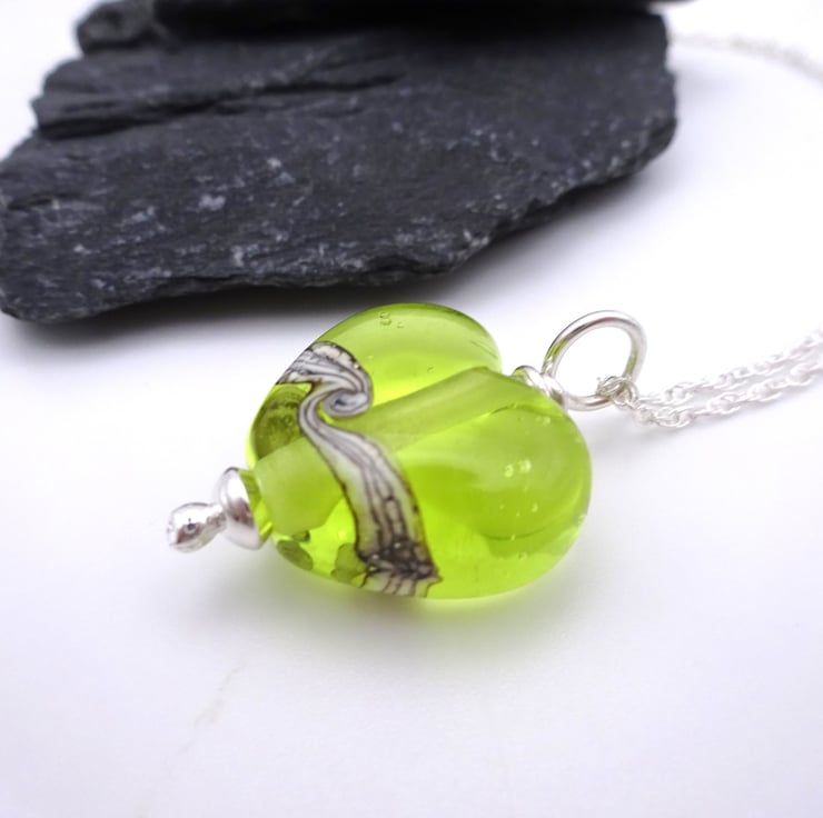 It features a sterling silver chain strung with a handmade lampwork glass yellow/green heart pendant.
