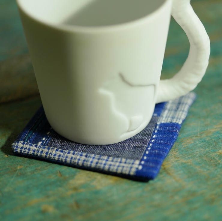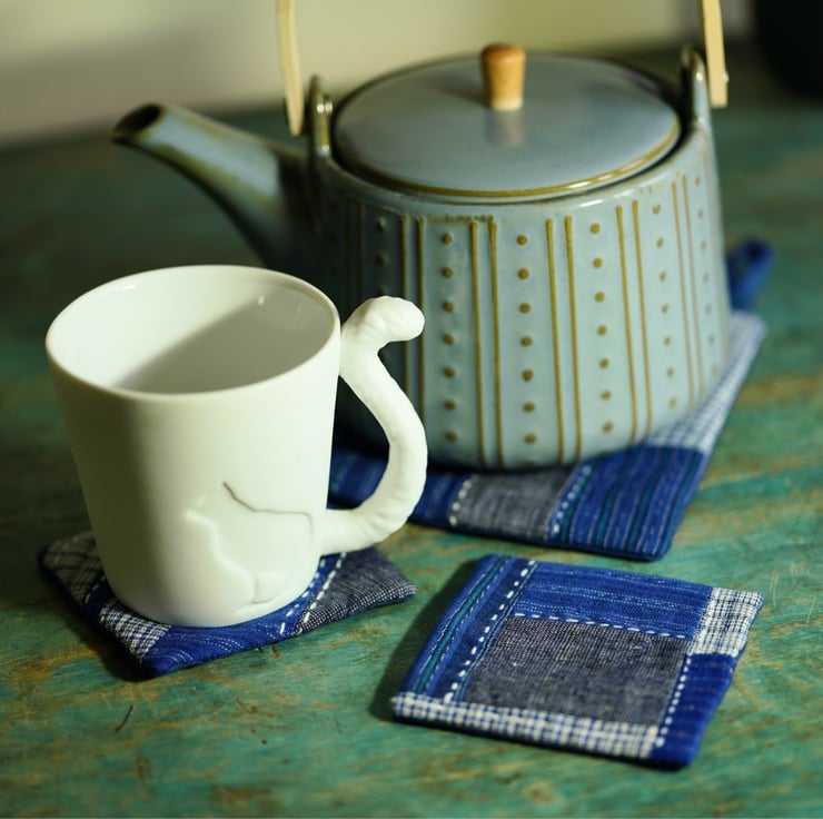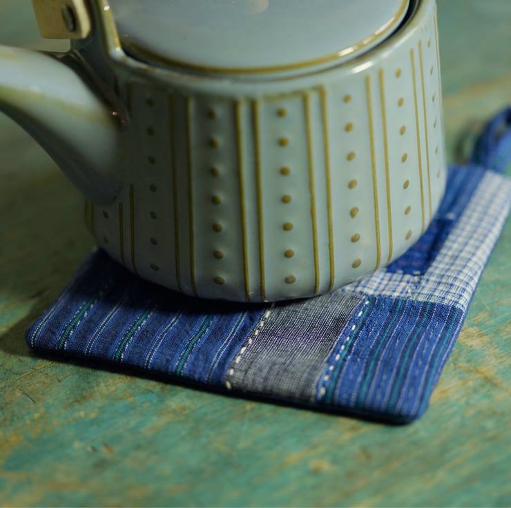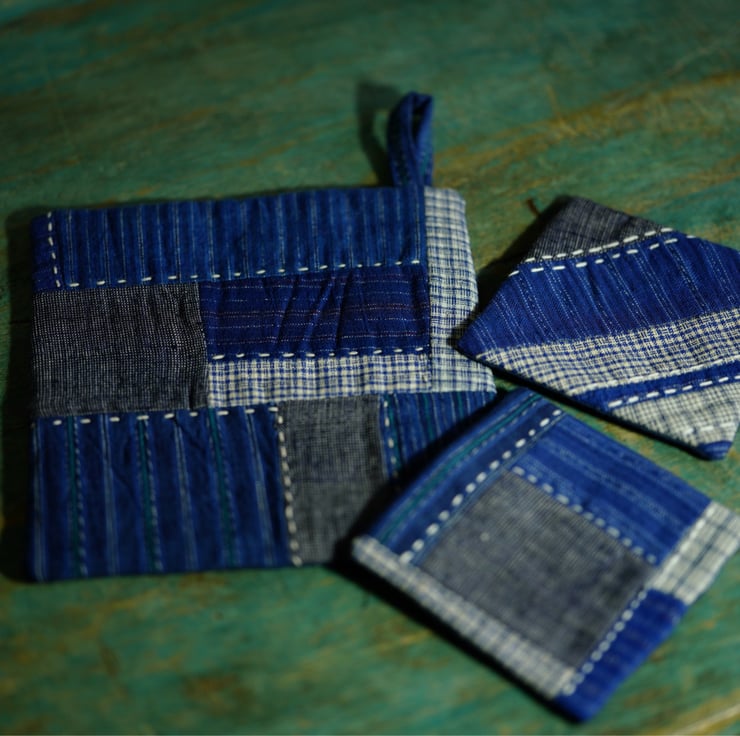This beautifully handcrafted fabric coasters and pot holder set combines rustic charm with practical function, offering protection and style for your table. Made from vintage Chinese cotton fabrics, each piece is one of a kind, featuring the unique texture and character of handwoven homespun yarns. The set includes 2 fabric coasters and a matching pot holder, each with an insulated layer inside to protect your surfaces from heat while adding a cozy touch to your home.