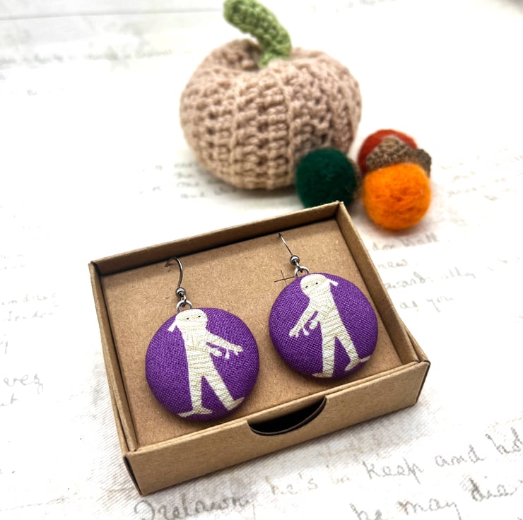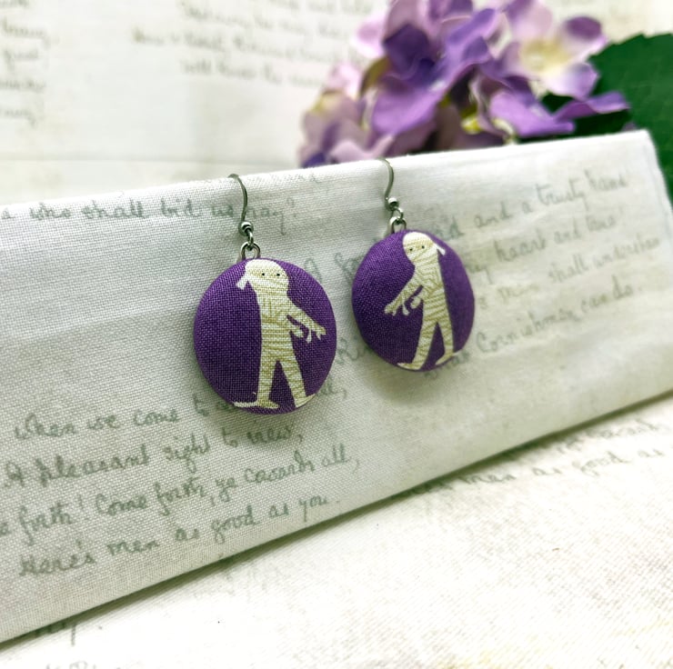 These fun and funky earrings have been created from 100% cotton fabric featuring walking Mummies on a purple background.