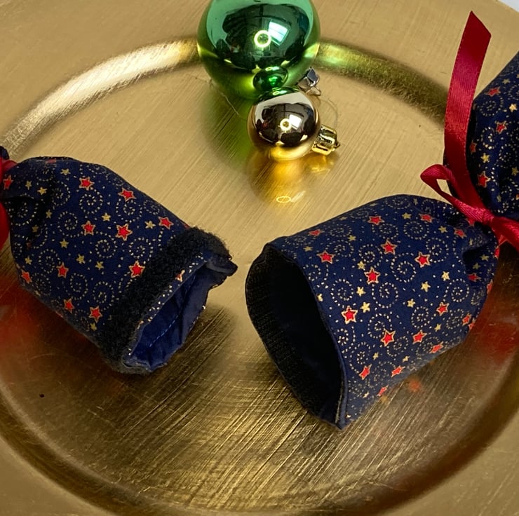 Our crackers are made in two parts which velcro together in the middle. They can be pulled like a normal cracker but make a crackling, tearing sound rather than a bang. The crackers measure approximately 5cm in diameter (slightly larger than the average toilet roll middle) and so there is plenty of space to add gifts and treats. A good shape is maintained by the addition of lengths of stiff hessian webbing. A snap can be inserted into the cracker, if you prefer the familiar ‘bang!’ Crackers are approximately 30cm long. They have coordinating ribbons for tying the ends. Bells can be added as well, if you choose, for a small additional cost.