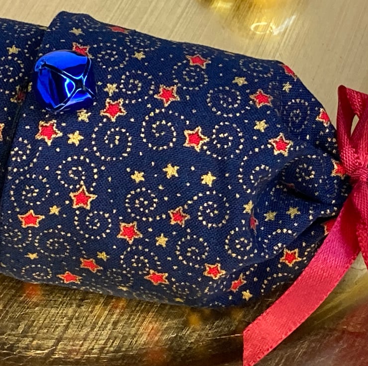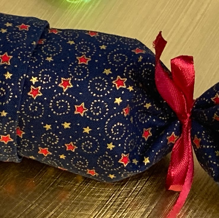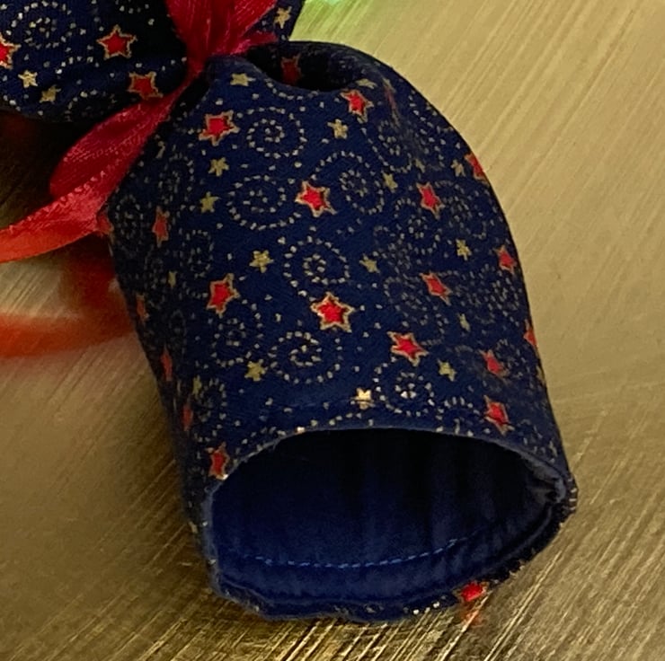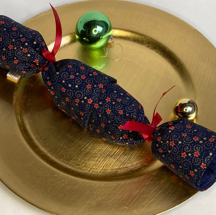 This beautiful Christmas cracker is a simple way of reducing the wastage that usually accompanies shop-bought ones. The cracker is carefully made from good quality fabrics and can be filled with your choice of trinkets, chocolates, hats or miniature bottles of drink. It can be used over and over again, saving you money each year. We are selling individual crackers so that you can choose the number you need in a variety of fabrics. This handsome one is navy with red stars and is tied with red ribbons. This design is also available in green and red. Matching crowns to go inside your crackers are available.