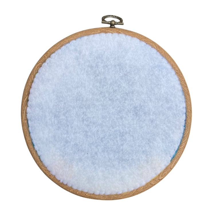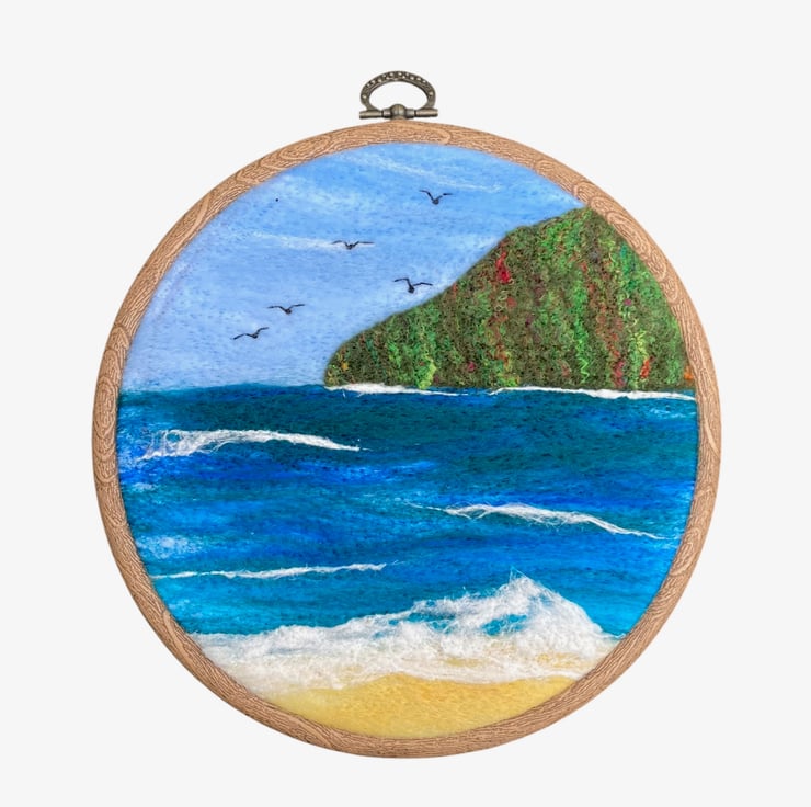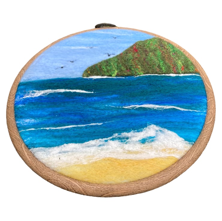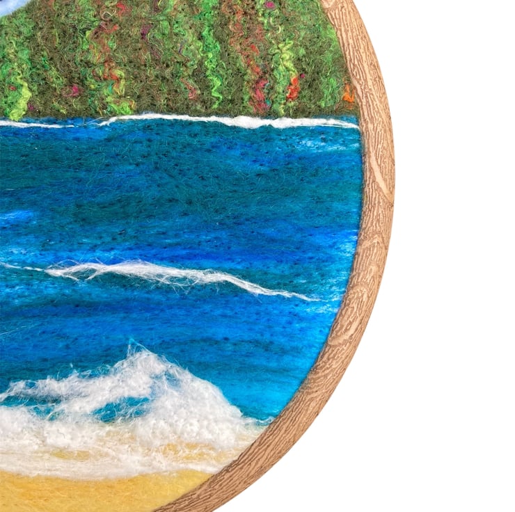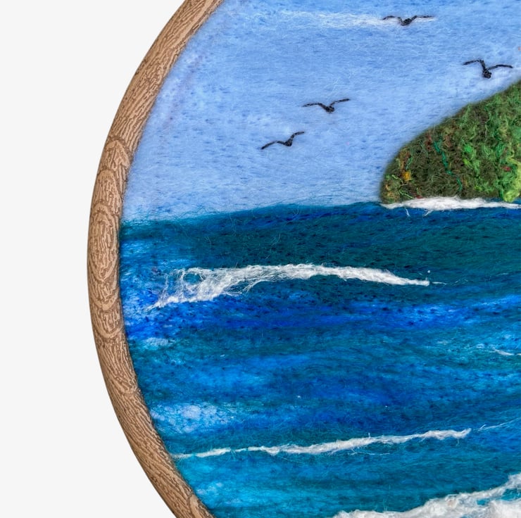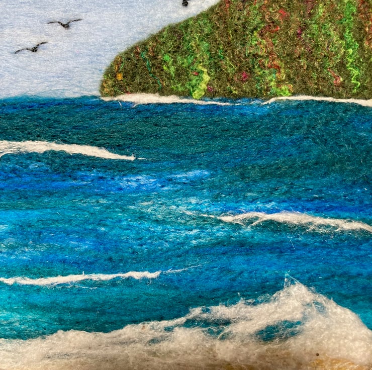This lovely woollen textile picture of a seascape with headland has been needle felted using woollen fibres and a barbed felting needle. The woollen fibres have been needle felted to a piece of backing felt to create the background. The headland which is a piece of handmade felt enhanced with silk fibres has been added and the surf created using white silk fibres. A few birds have been stitched on using thread. The resulting picture has been mounted in a 6" (15cm) diameter embroidery hoop and the reverse of the picture has been covered using a piece of white commercial felt.