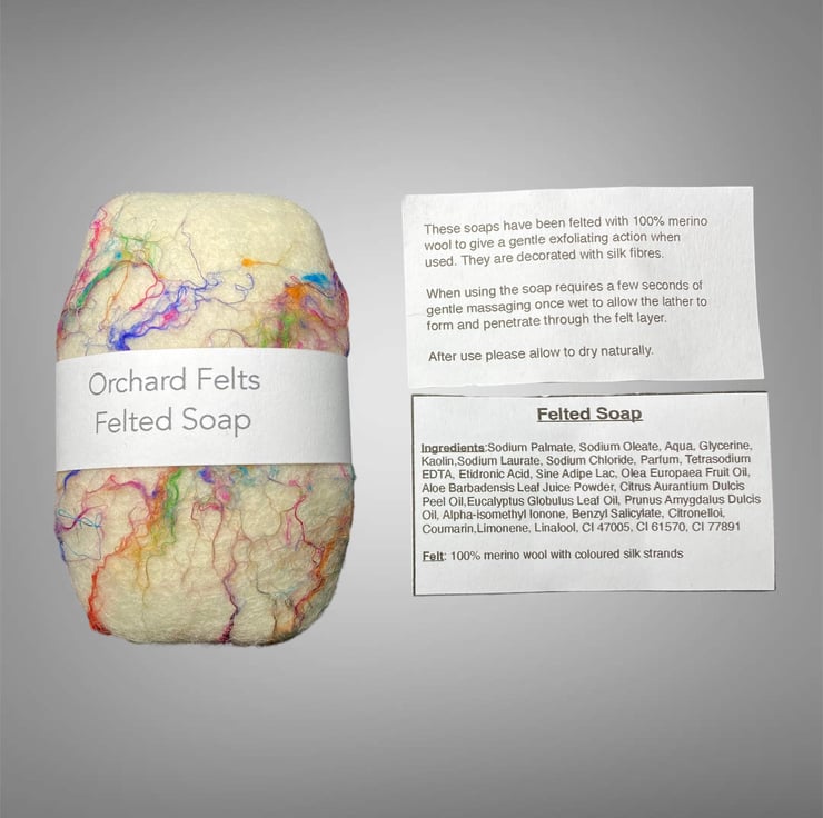 Each soap comes with a card with the soap ingredients listed and also a bit of information about the felting process. The soap bars are all different in the colour combinations of the silk fibres added, as shown in the photographs, and one will be sent at random.