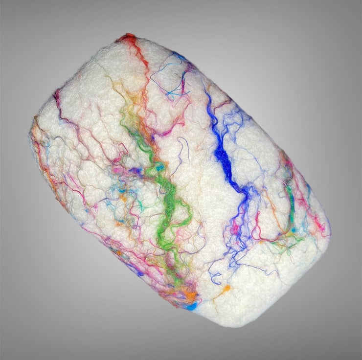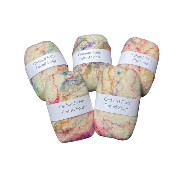Beautiful felted soap which would make a lovely gift for any occasion. These bars of soap have been wrapped in layers of soft merino natural white (unbleached) wool fibres. Multicoloured silk fibres have been added to the surface and the wool/silk layers have then been felted to form a tight wrap around the soap.
