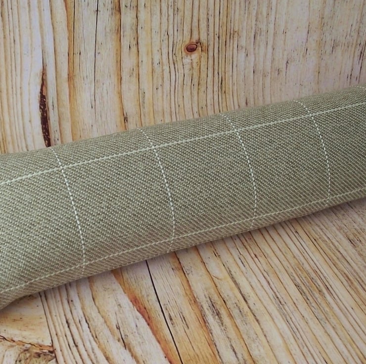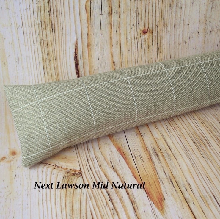 This is a handmade draught excluder, crafted using Next Mid Natural fabric - wool effect. This is a sand, light beige coloured fabric. Filled with buckwheat hulls and wheat. This excluder weighs more than 4 times the weight of a hollow fibre filled excluder.