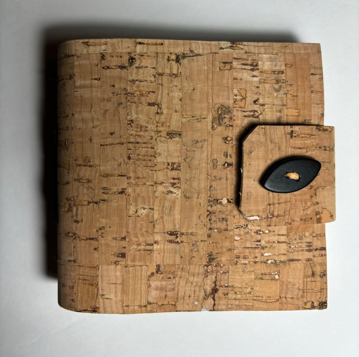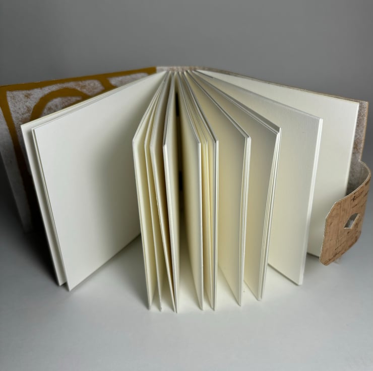 This is a nice little book to take out and about to jot down ideas or to make quick sketches. It fits easily into a pocket or handbag, as it measures 10.5 x 10 x 2 cm, and the pages are protected inside the soft cork cover, which is secured with a button. It is full of off-white pages of plain paper and has an abstract design for the endpapers. It is bound in long-stitch style; this style of book binding allows the leaves of the book to open wide and to lie flat.