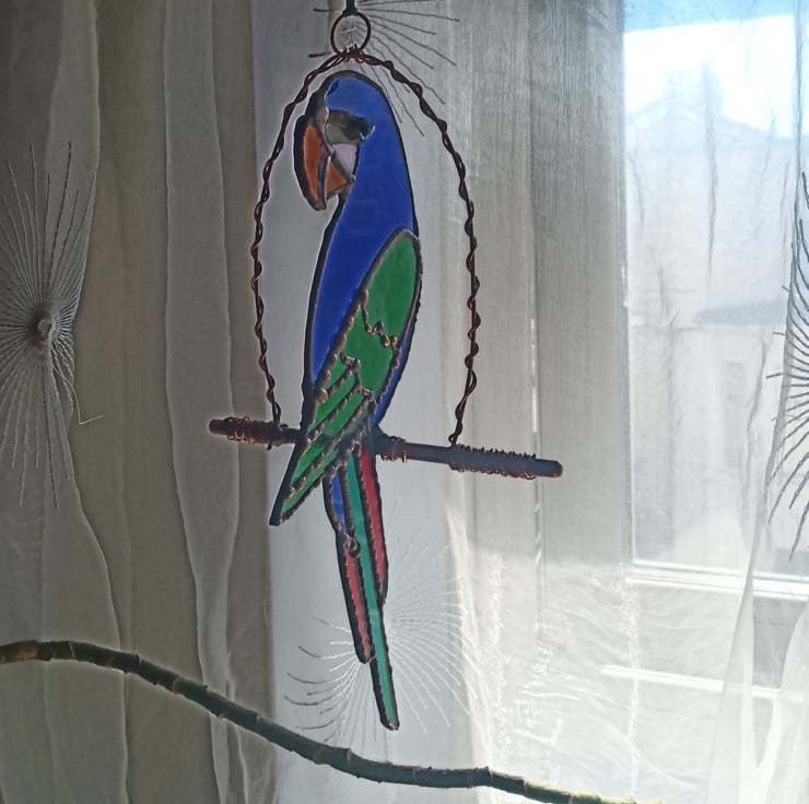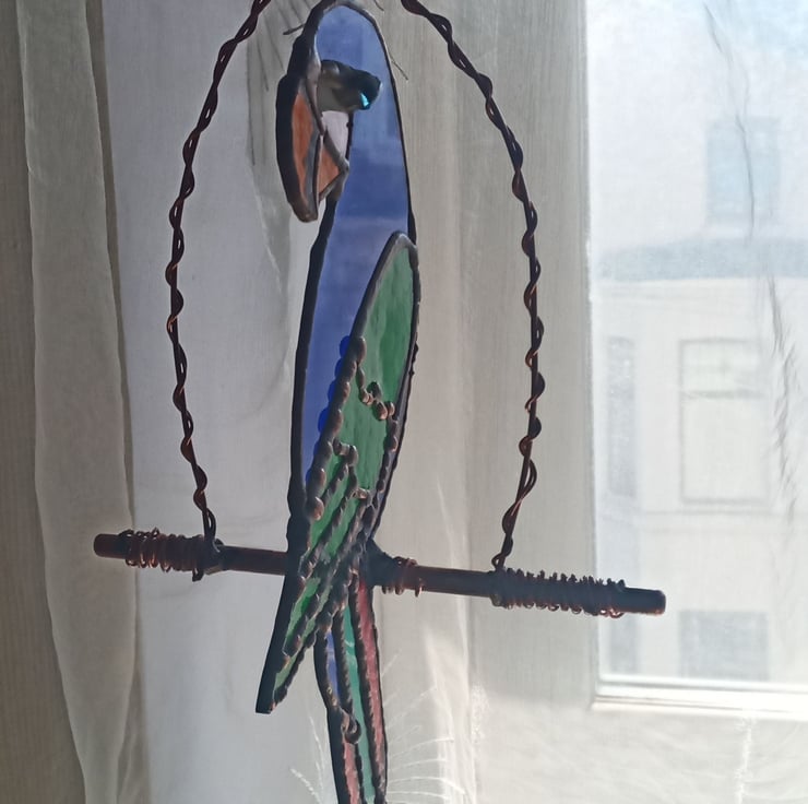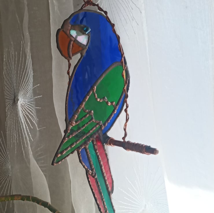 A beautiful stained glass parrot made using a mixture of textured glass in various shades of red, blue, green and orange sitting on a copper wire perch. The perfect gift for bird lovers, looks great hanging in a window, under a lamp or outside amongst the flowers in the garden.