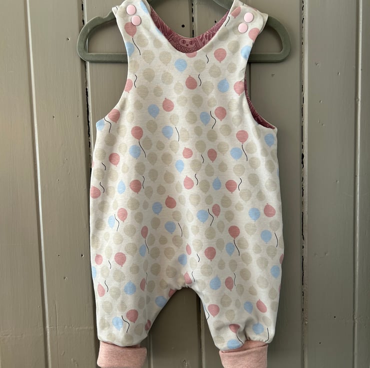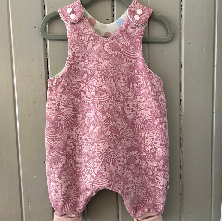 Reversible, comfy, stretchy cotton romper with a dusky pink owl pattern on one side and balloons on the reverse. A perfect little outfit for your baby that can be reversed. Co-ordinating popper fastenings on the shoulders (colours may vary slightly).