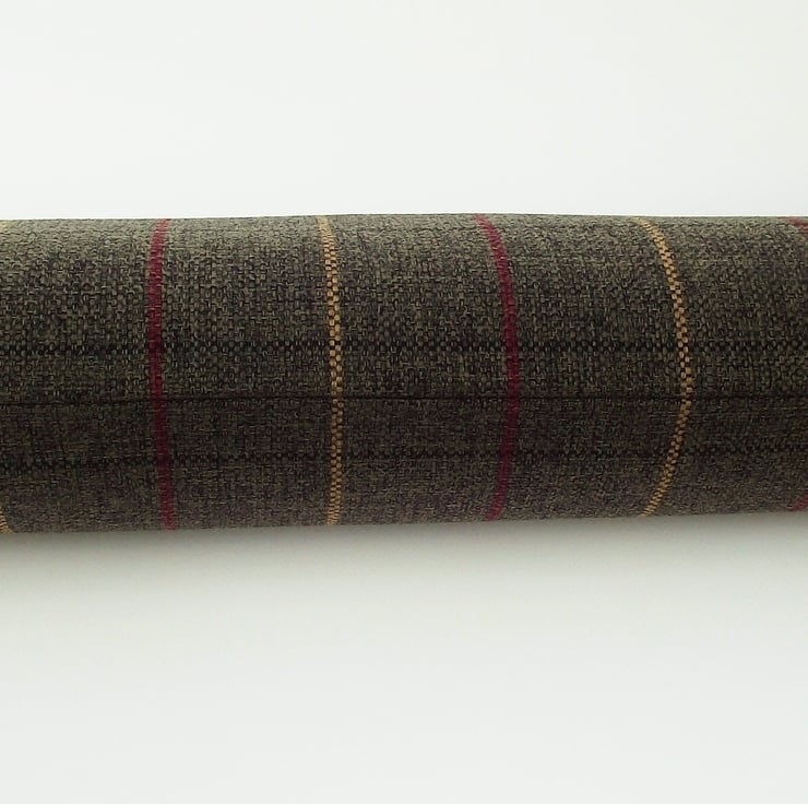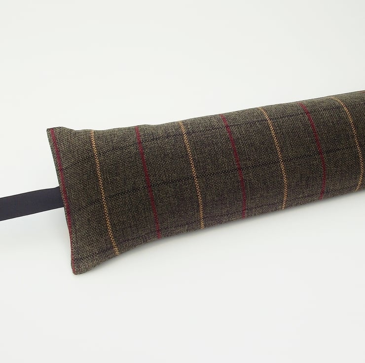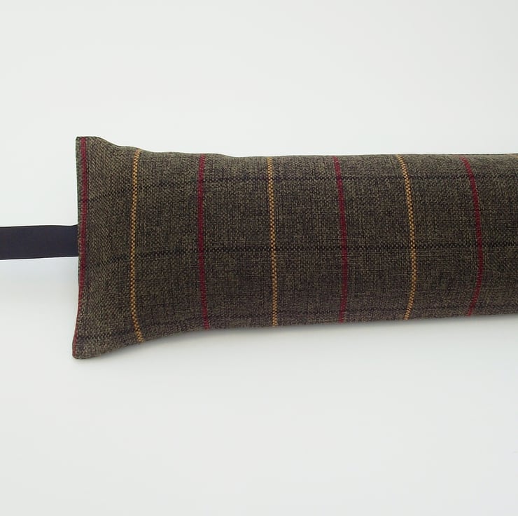 This is a handmade draught excluder, crafted using a dark brown upholstery weight fabric with a black, mustard and red check. Filled with buckwheat hulls and wheat. This excluder weighs more than 4 times the weight of a hollow fibre filled excluder.