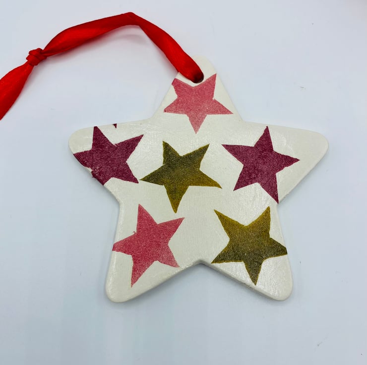Inspired by the Emma Bridgewater star design paper napkin, this red, pink and green decorated star makes a beautiful christmas ornament. Perfect for hanging on your tree, in a window, or even as a small gift.