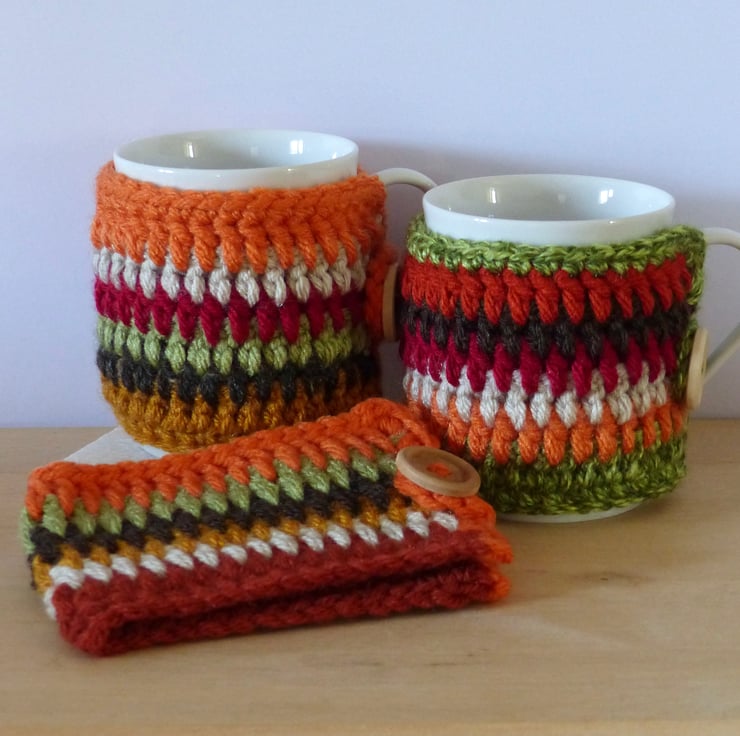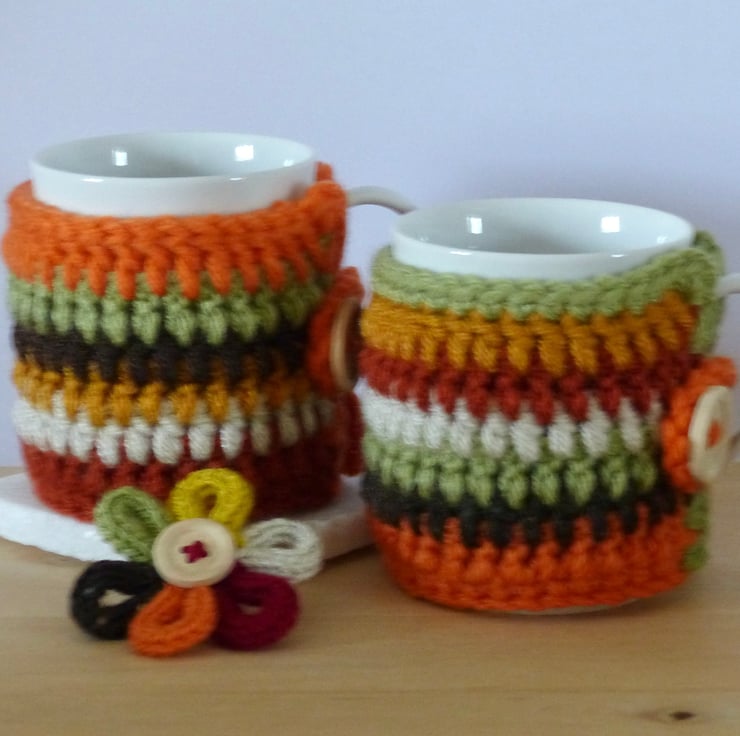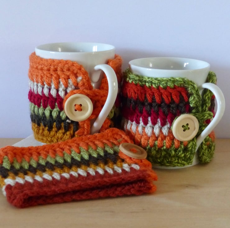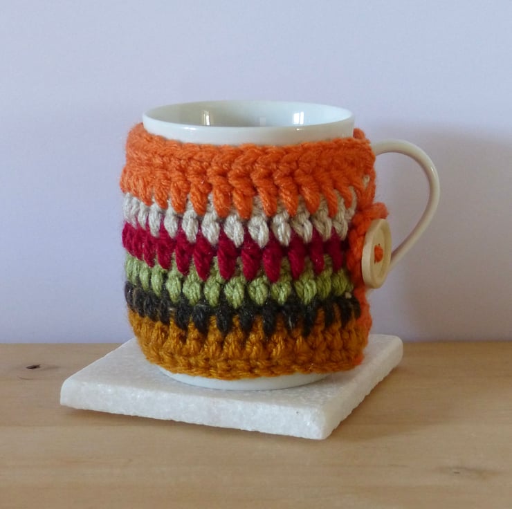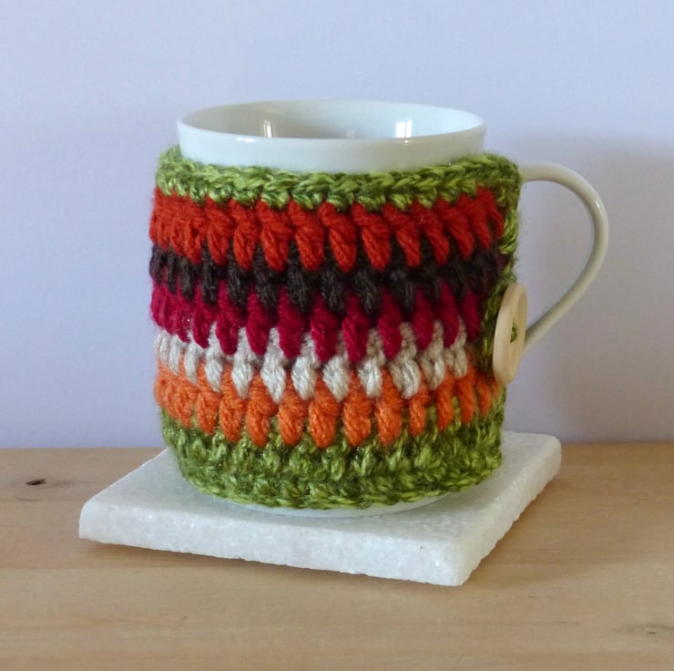 A crocheted Mug Cosy using chunky yarns in rich Autumn colours. It measures approximately 25cm long by 9cm wide so should fit most standard mugs. Just wrap it around and fasten with the crocheted loop and natural wood button.