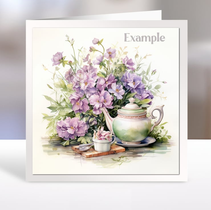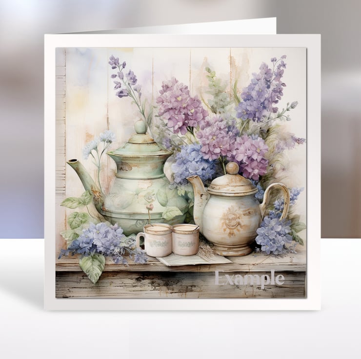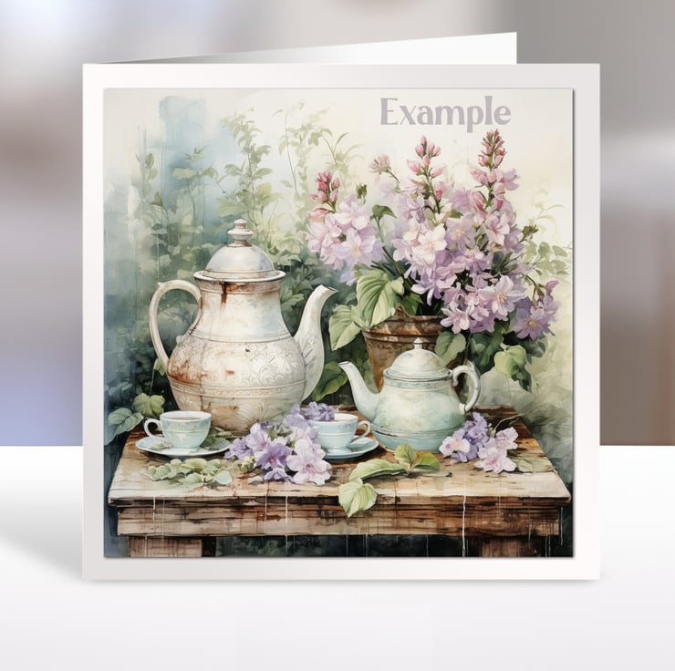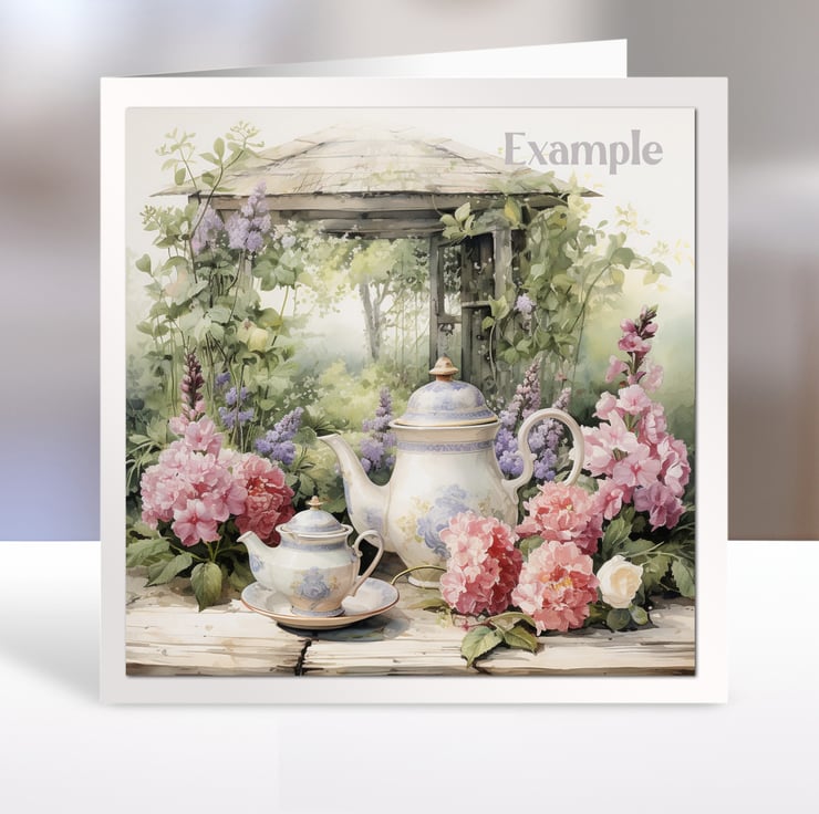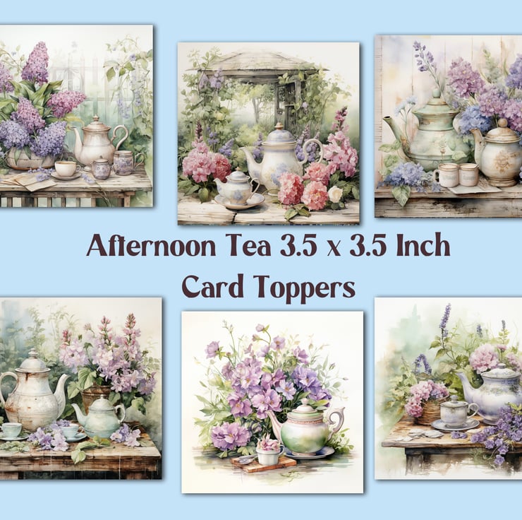 A set of six beautiful 3.5 inch square card toppers with pastel coloured florals and tea sets in gardens- Afternoon Tea